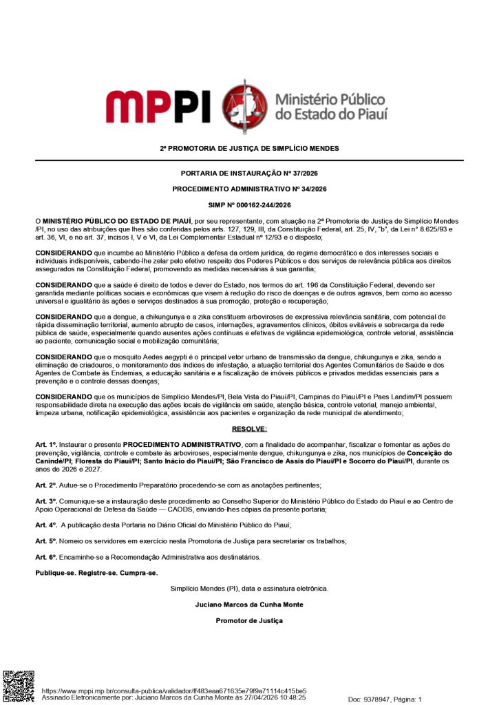 A 2ª Promotoria de Justiça de Simplício Mendes, por meio do Promotor de Justiça Dr. Juciano Marcos da Cunha Monte, expediu a Recomendação Administrativa nº 13/2026, no âmbito do Procedimento Administrativo SIMP nº 000162-244/2026, com o objetivo de fortalecer as ações de prevenção, vigilância, controle e combate às arboviroses nos municípios da microregião.