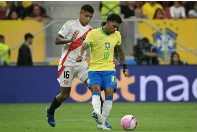 Rodrygo em ação em Brasil x Peru, pelas Eliminatórias — Foto: Nelson Almeida/AFP