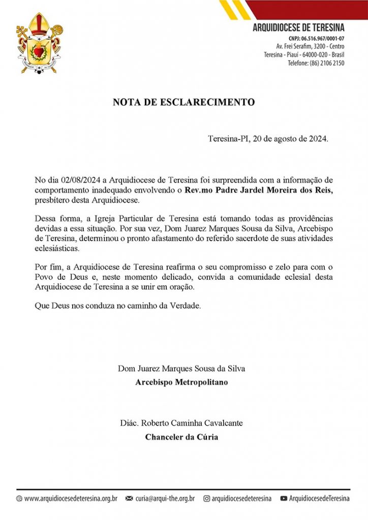 A Arquidiocese de Teresina anunciou, por meio de nota oficial, o afastamento do padre Jardel Moreira dos Reis de suas atividades eclesiásticas devido a um “comportamento inadequado”. A decisão foi comunicada após a Arquidiocese tomar conhecimento do caso em 8 de agosto deste ano.