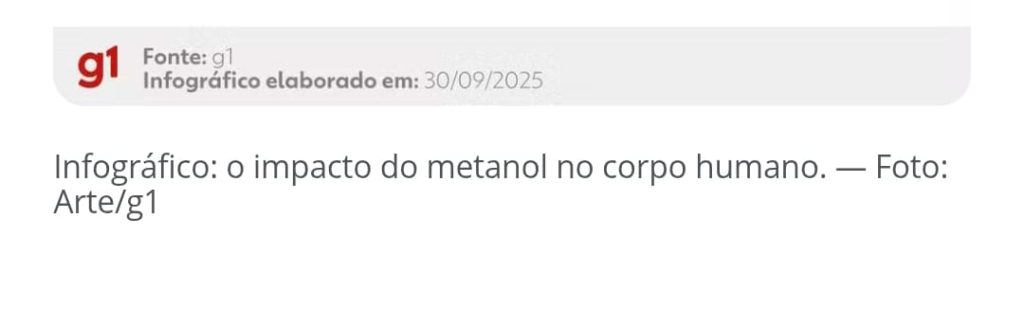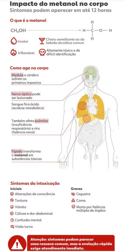 🔍 O metanol é um álcool usado industrialmente em solventes e outros produtos químicos, é altamente perigoso quando ingerido. Inicialmente, ataca o fígado, que o transforma em substâncias tóxicas que comprometem a medula, o cérebro e o nervo óptico, podendo causar cegueira, coma e até morte. Também pode provocar insuficiência pulmonar e renal.