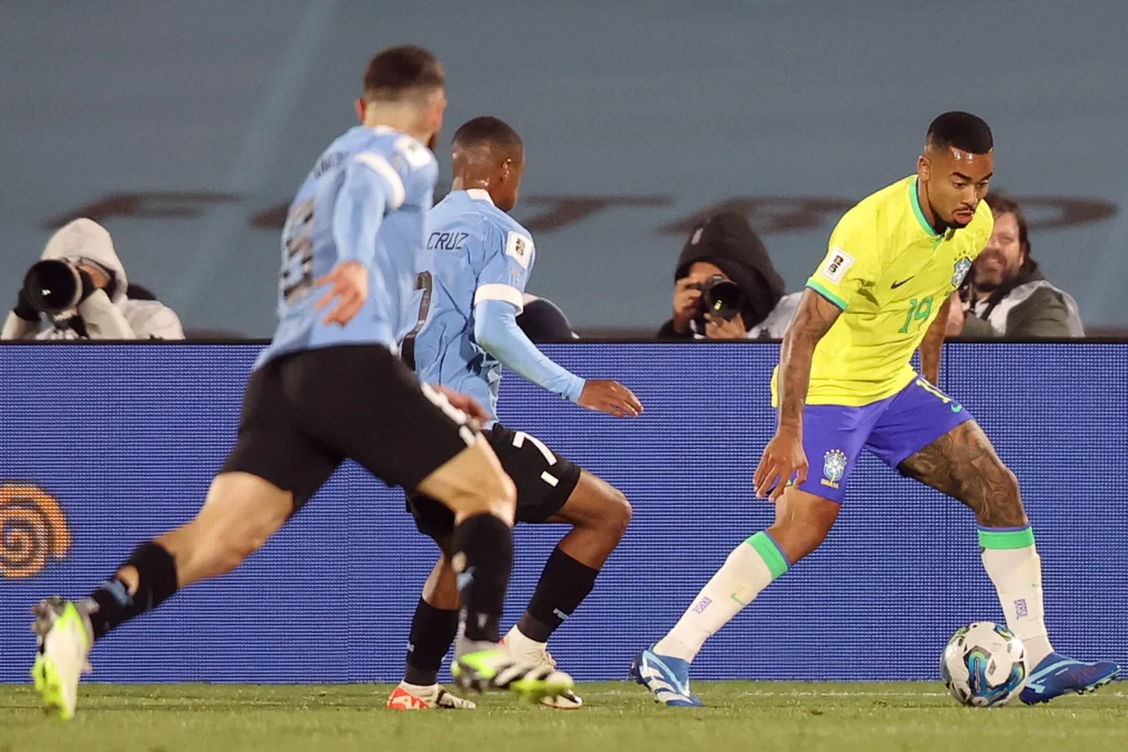 Aos 26, Gabriel Jesus fez bonita jogada individual, driblou dois marcadores uruguaios mas, na hora de finalizar, acabou travado pela defesa mandante.