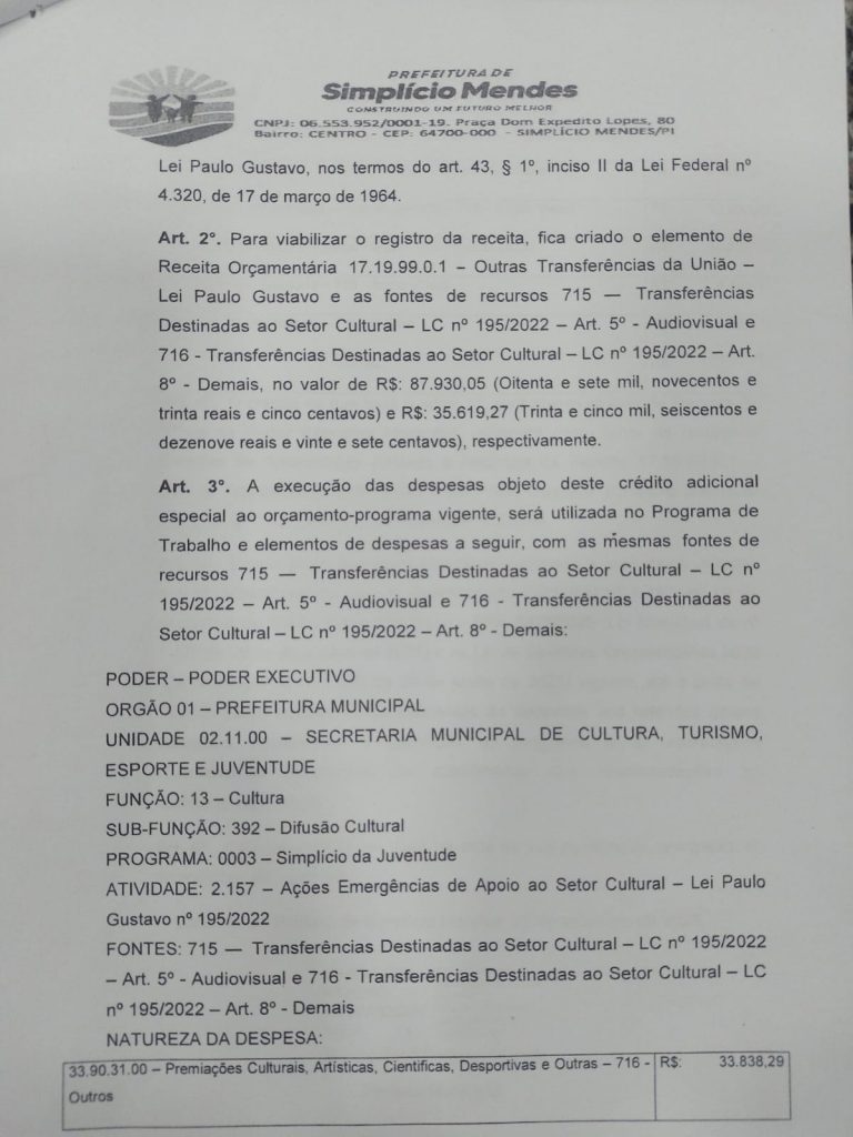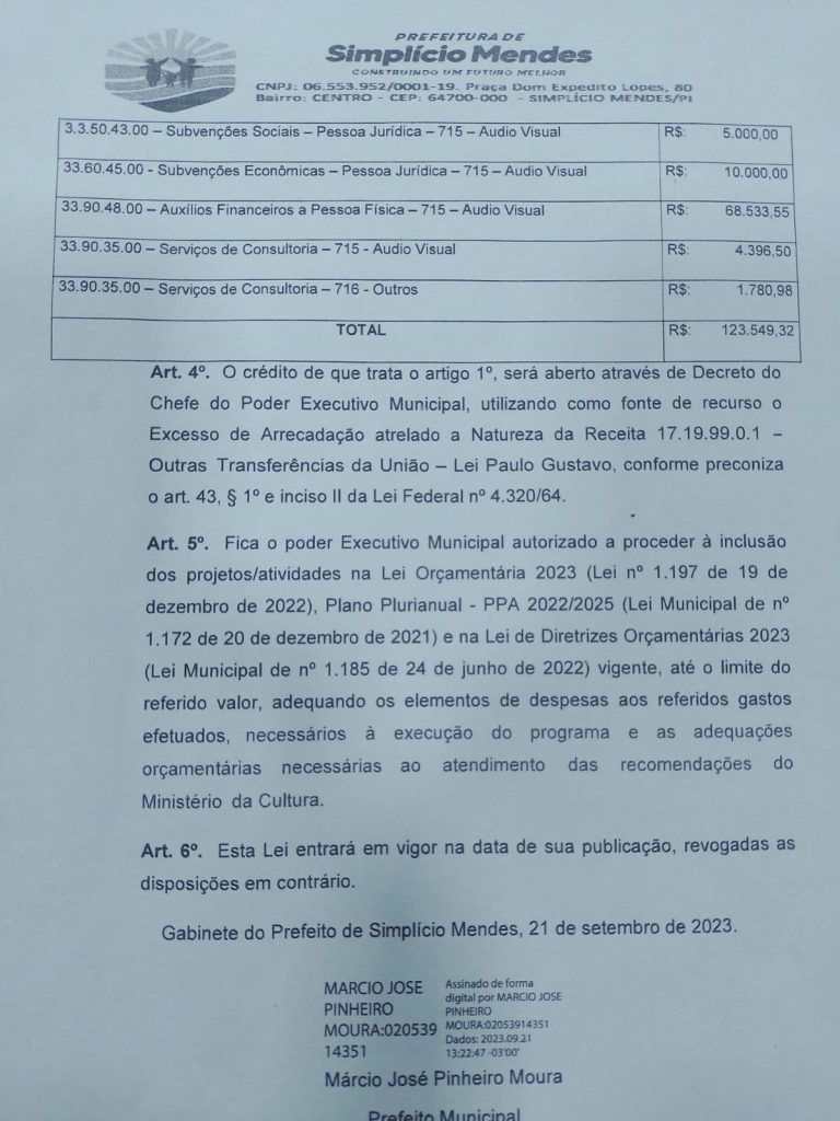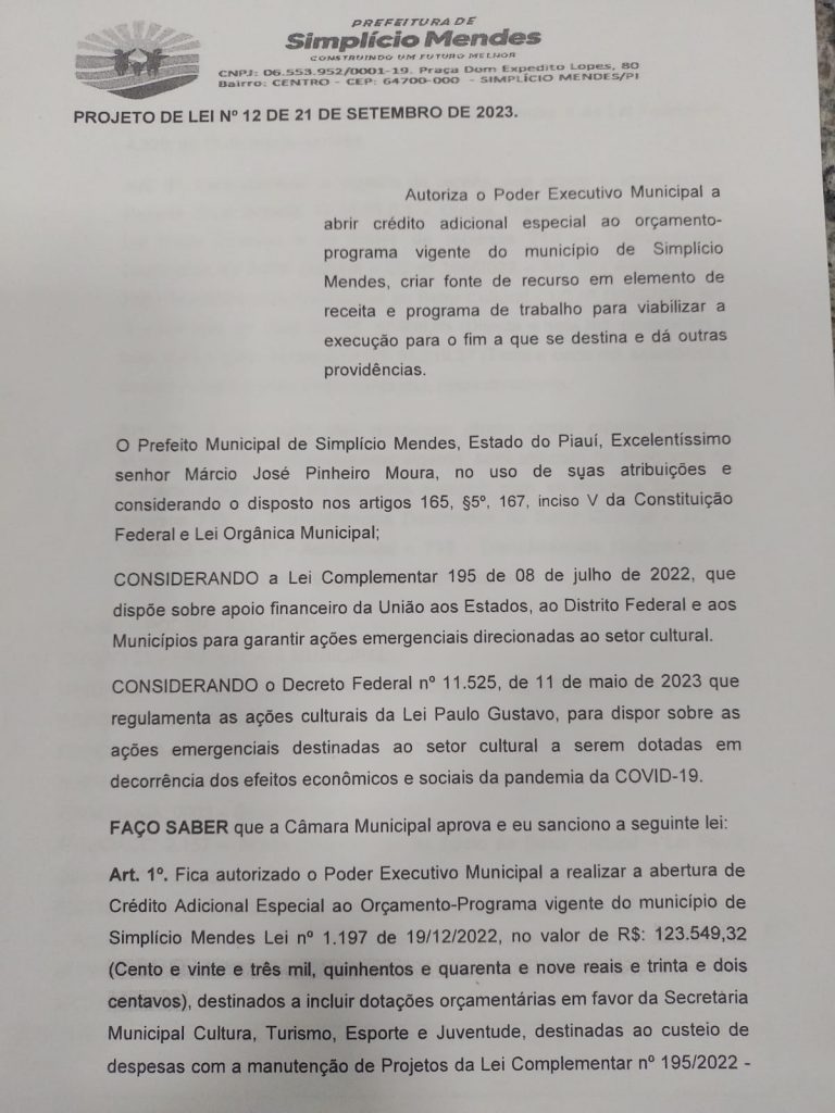 Foi aprovado na Câmara Municipal de Vereadores de Simplício Mendes, o Projeto de Lei nº 12/2023, que autoriza o Poder Executivo Municipal a realizar a abertura de crédito adicional especial ao Orçamento-Programa vigente do município no valor de R$ 123.549,32. Esses recursos serão destinados ao custeio de despesas com a manutenção de projetos da Lei Complementar nº 195/2022, também conhecida como Lei Paulo Gustavo.