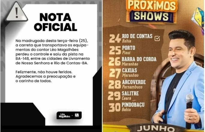 Nota oficial no instagram do cantor Léo Magalhães e agenda de shows do artista | FOTO: Reprodução/Instagram