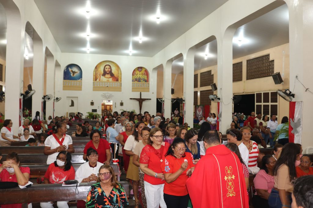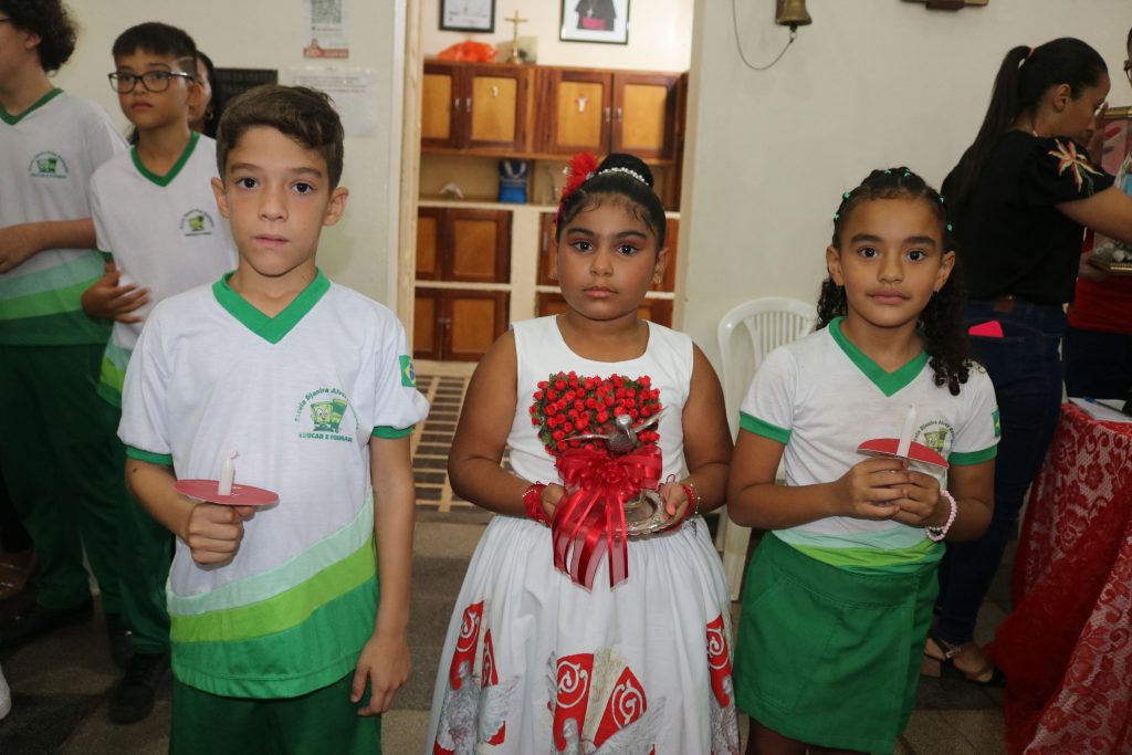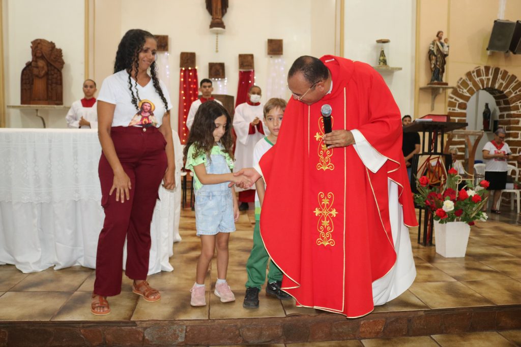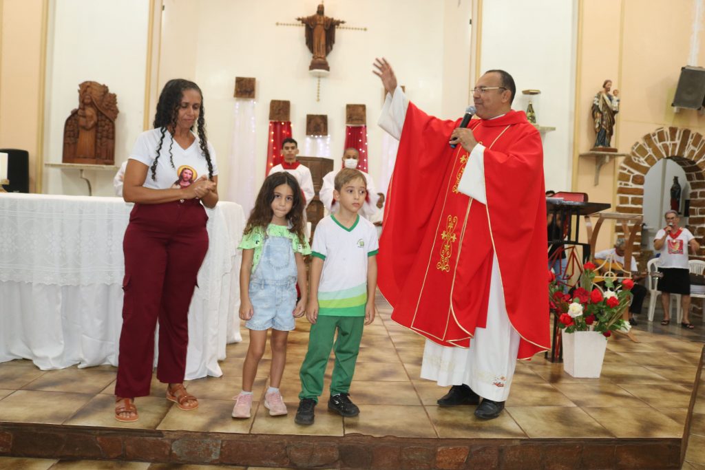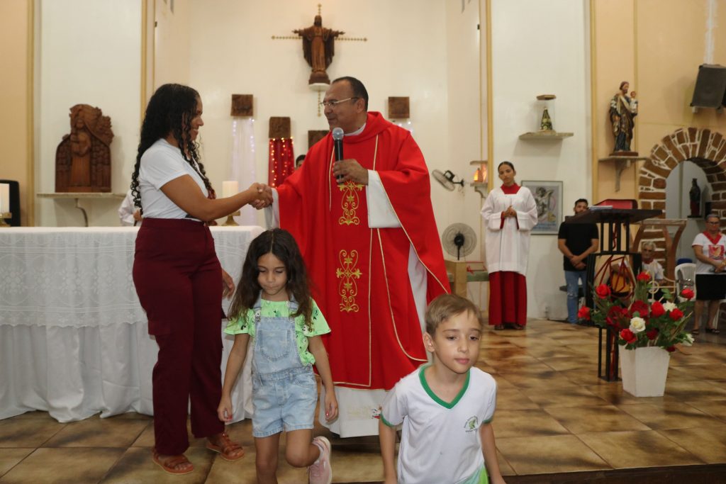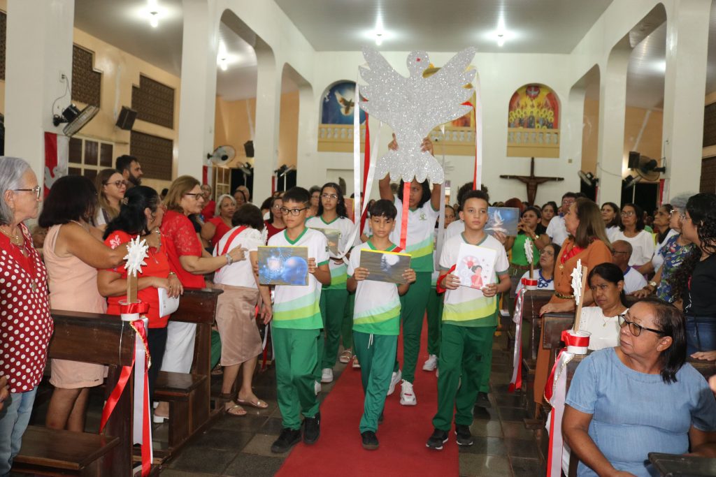 Uma das partes mais emocionantes da noite foi a participação dos estudantes da Escola Djanira Alves Rodrigues, que, após a comunhão, realizaram uma bela apresentação destacando os sete dons do Espírito Santo. Através de sua arte e talento, eles tocaram os corações dos presentes, transmitindo a mensagem de fé e renovação espiritual.