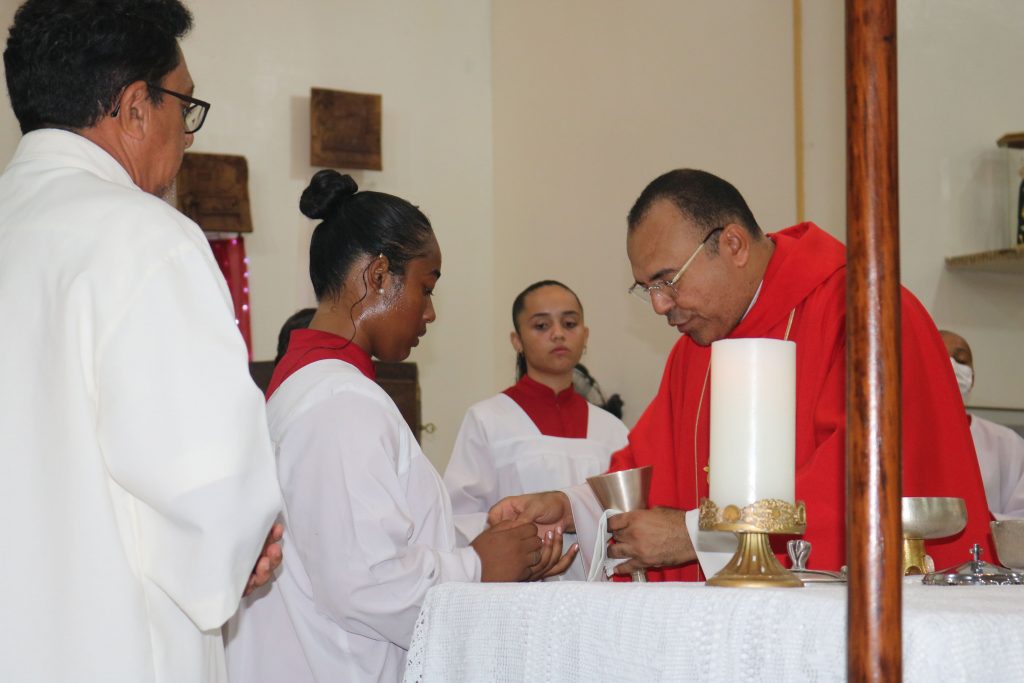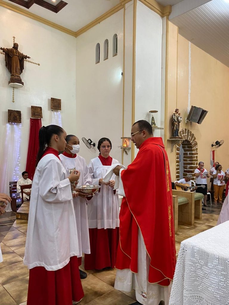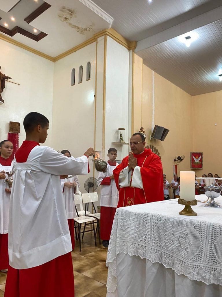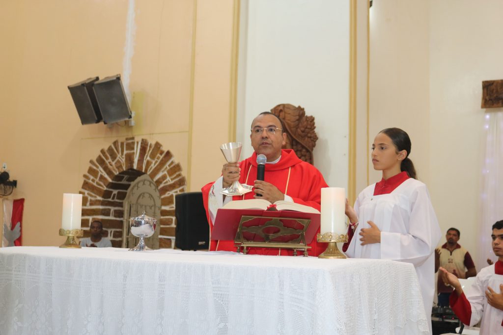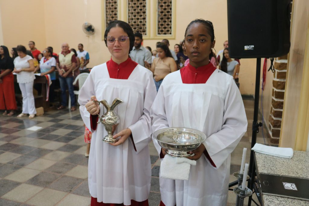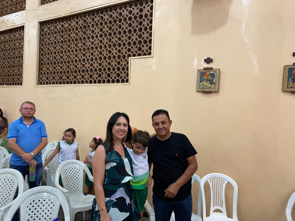 Uma das partes mais emocionantes da noite foi a participação dos estudantes da Escola Djanira Alves Rodrigues, que, após a comunhão, realizaram uma bela apresentação destacando os sete dons do Espírito Santo. Através de sua arte e talento, eles tocaram os corações dos presentes, transmitindo a mensagem de fé e renovação espiritual.