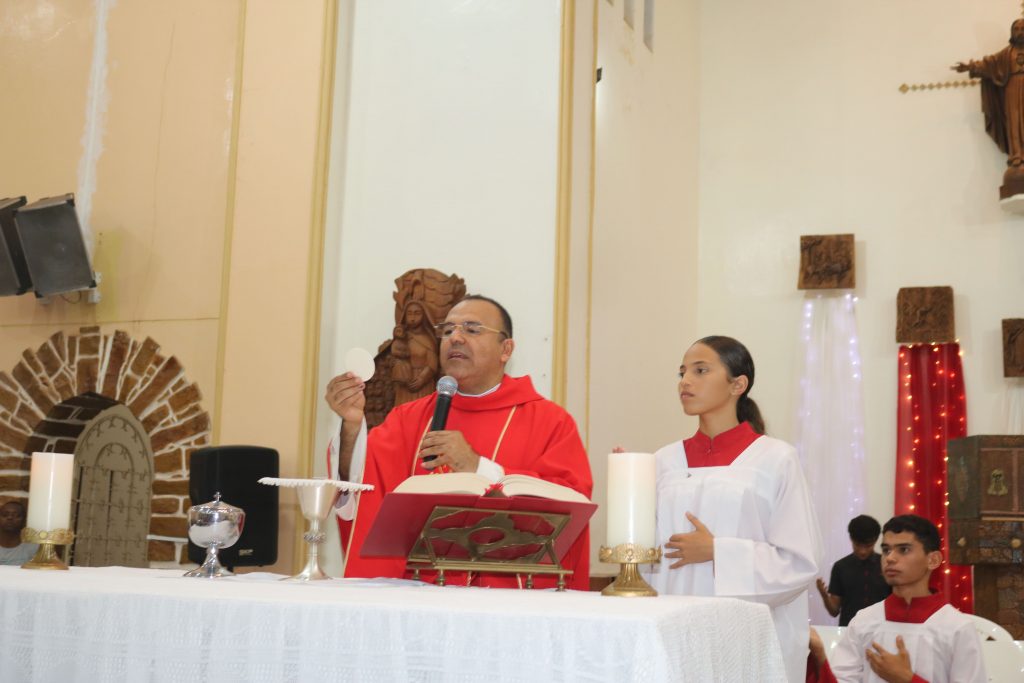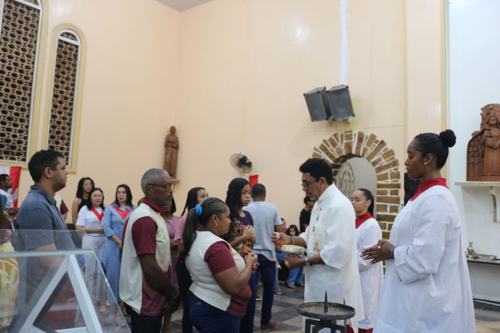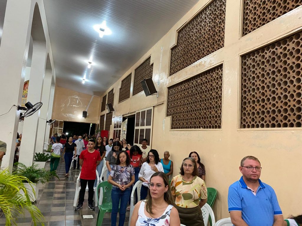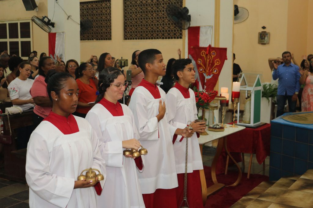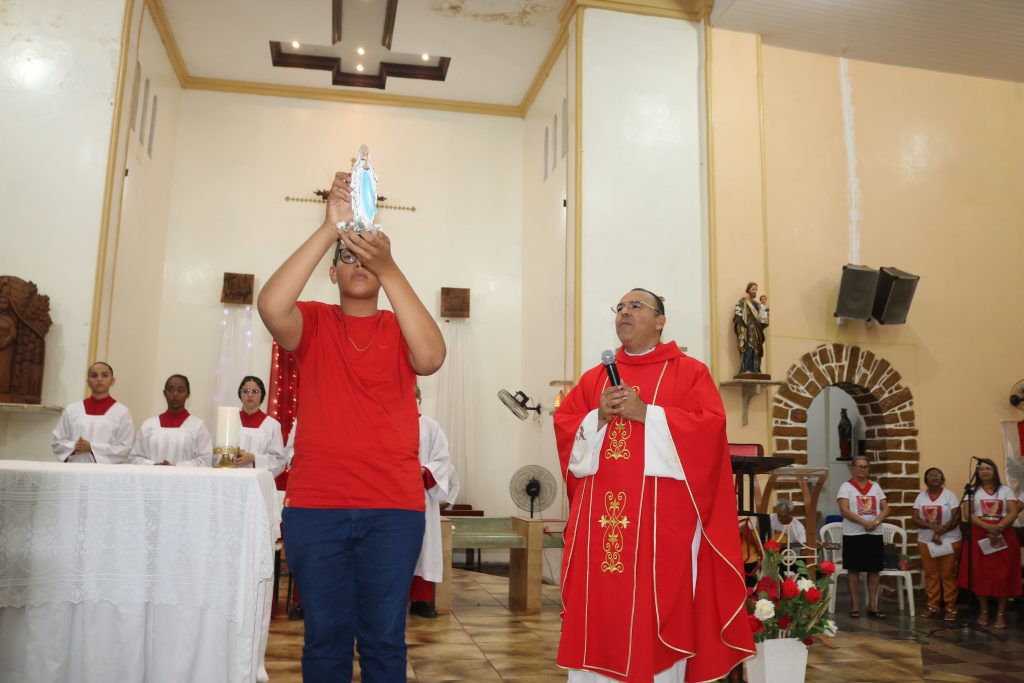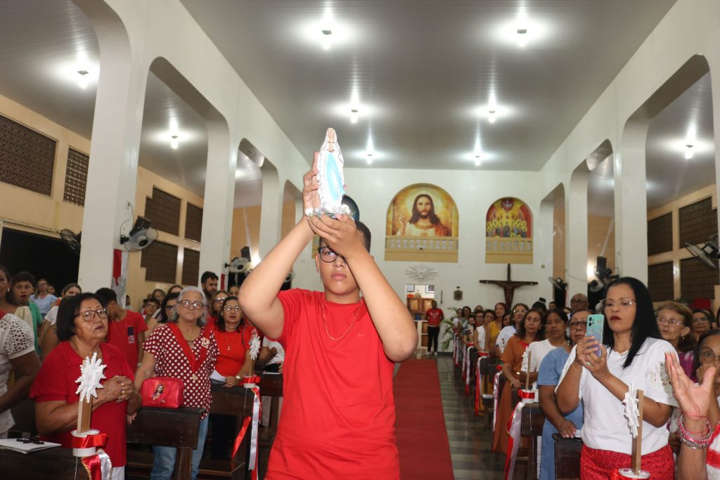 Em um gesto de devoção mariana, o jovem José Antônio percorreu solenemente a igreja com a imagem de Nossa Senhora de Fátima, enquanto o jovem Júnior entoava cânticos dedicados à Virgem Maria. Essa demonstração de amor e veneração à Mãe de Deus emocionou os fiéis, fortalecendo ainda mais a sua fé.