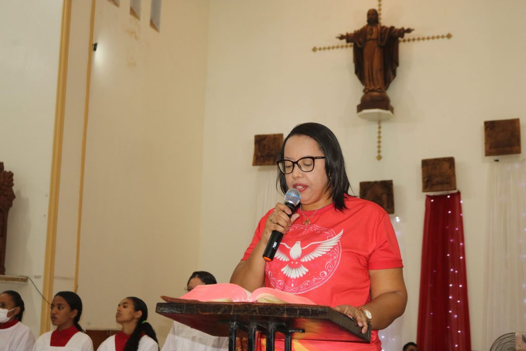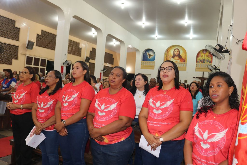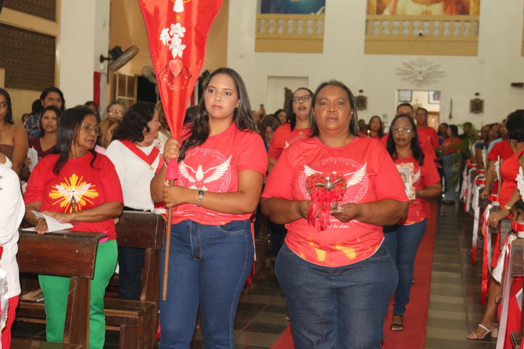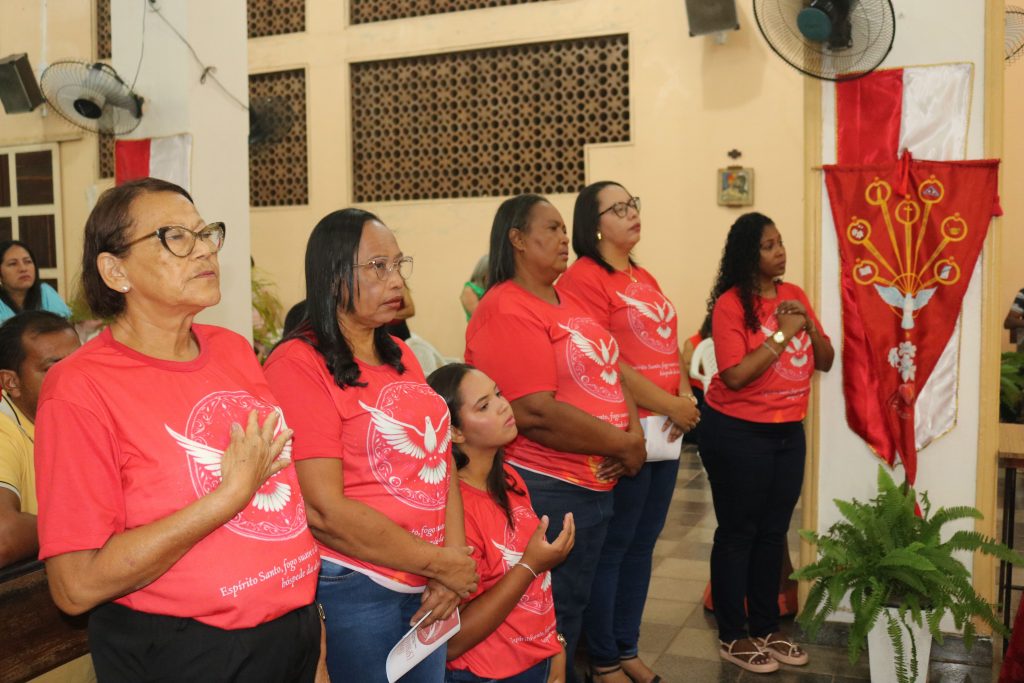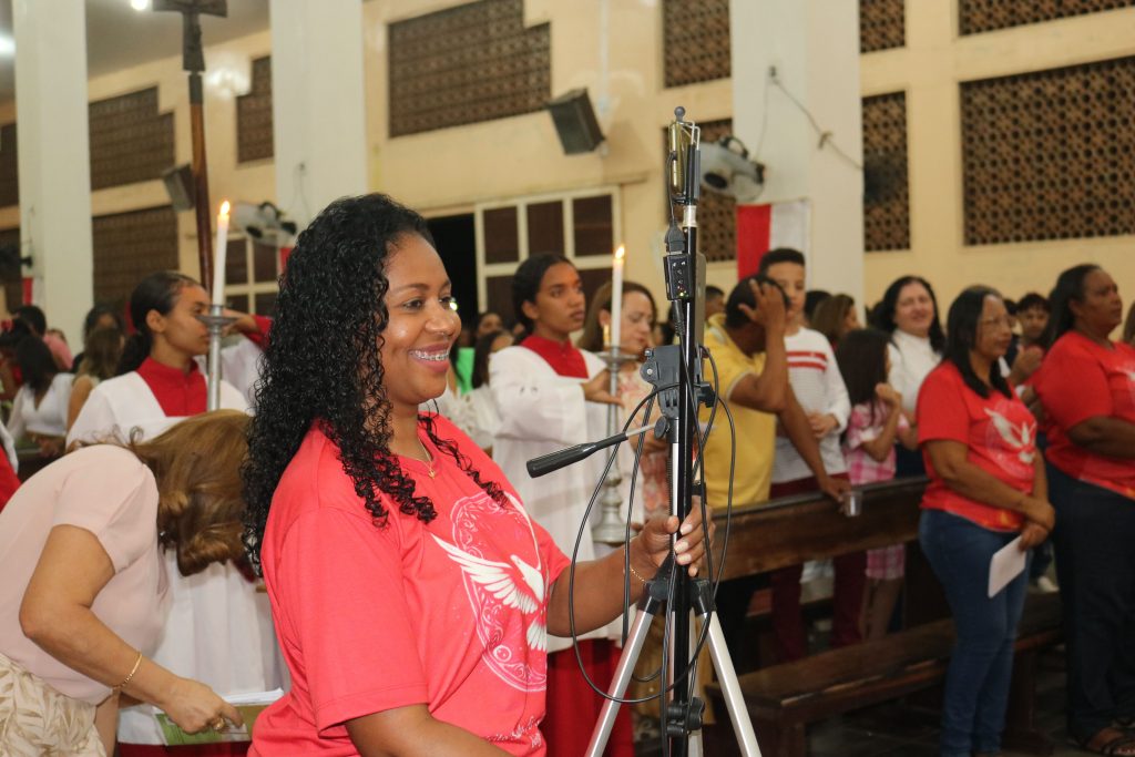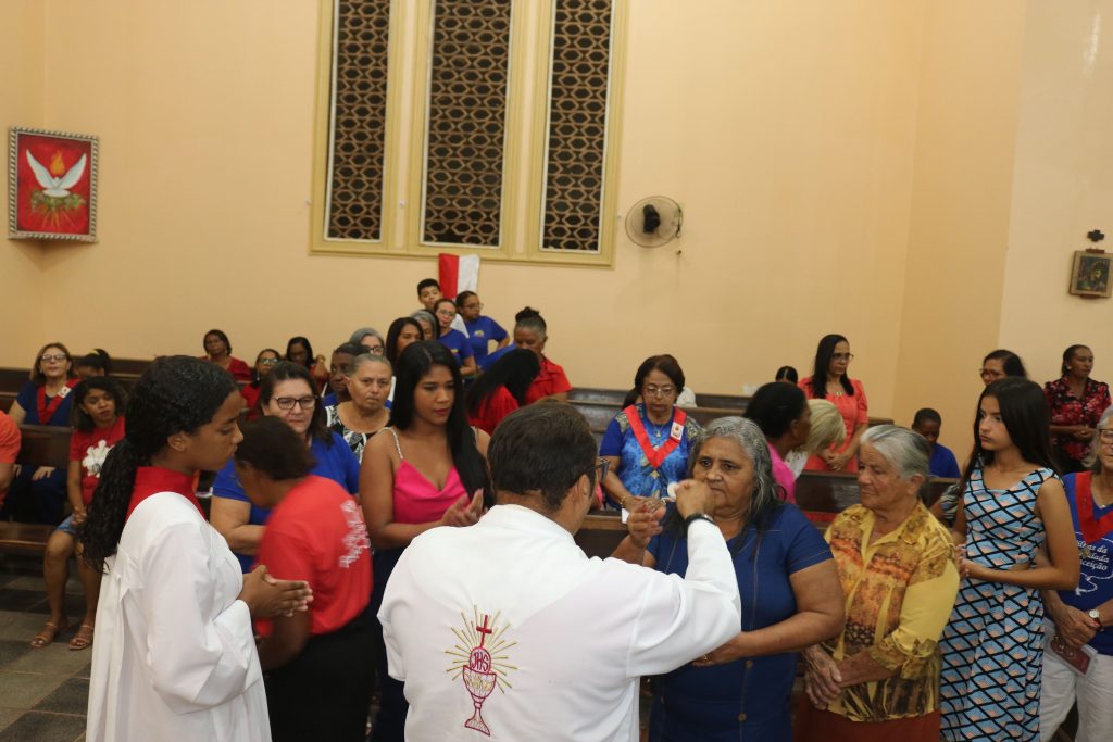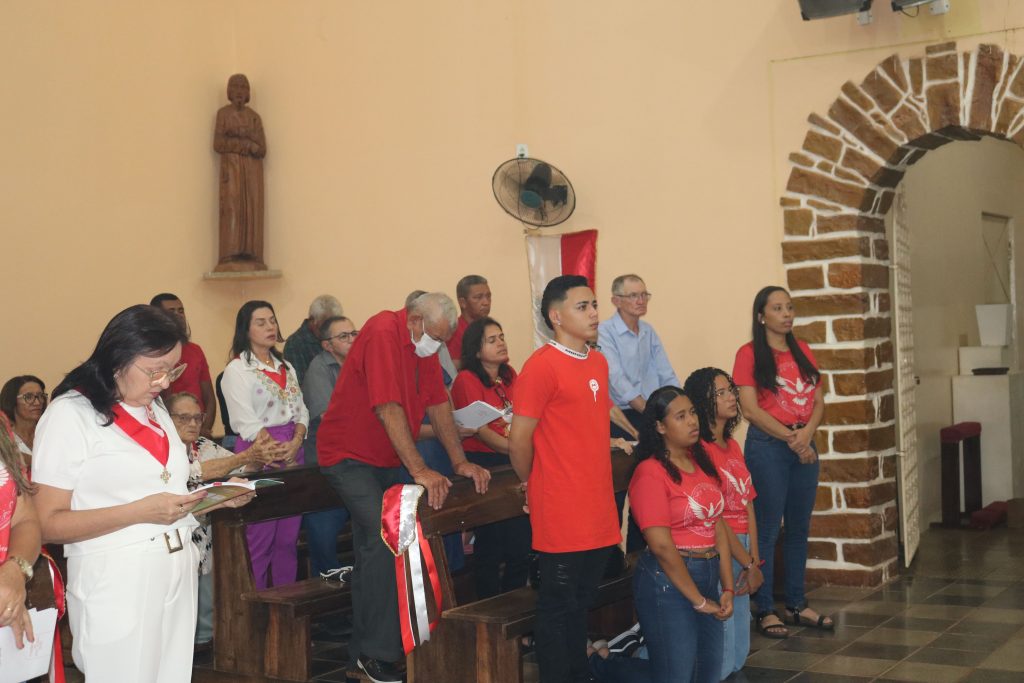 Após a comunhão, a alegria se fez presente com os parabéns entoados para Kaline, aniversariante do dia. Em seguida, um testemunho emocionante da senhora Maria ressoou pelos corredores, compartilhando a graça alcançada através da intercessão do Divino Espírito Santo.