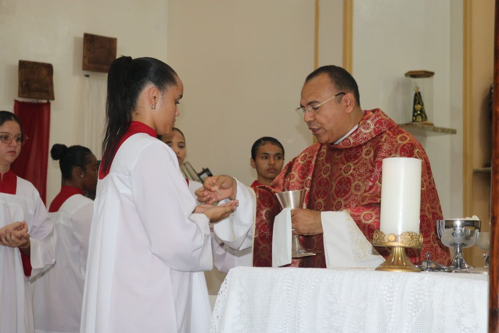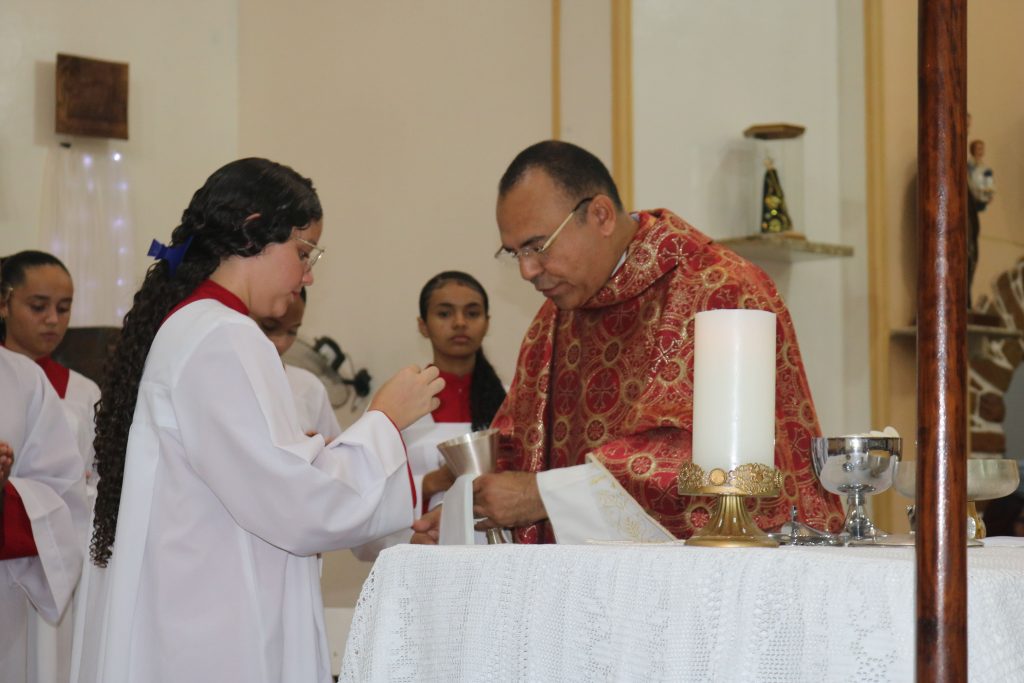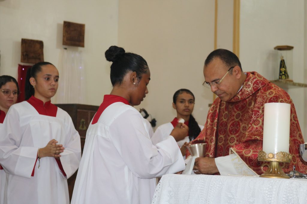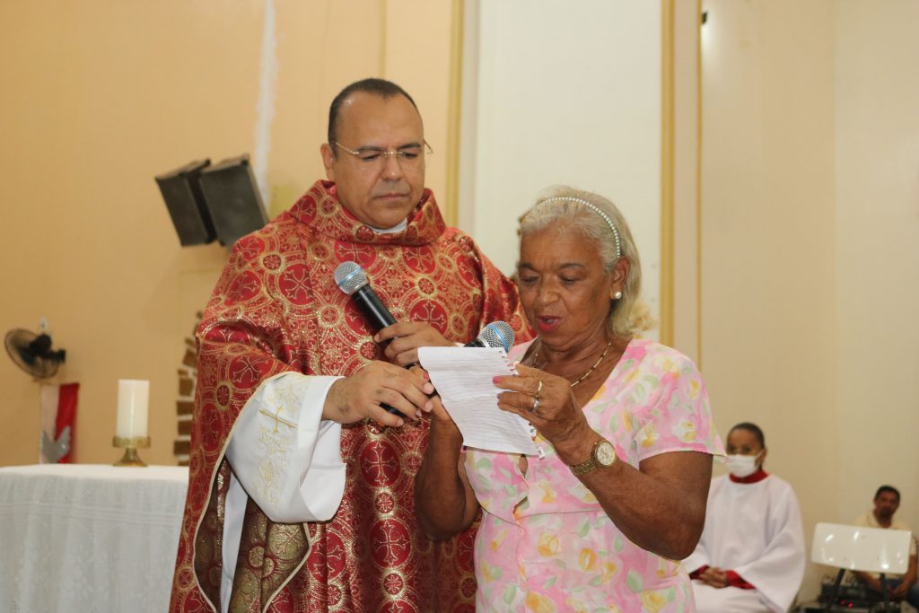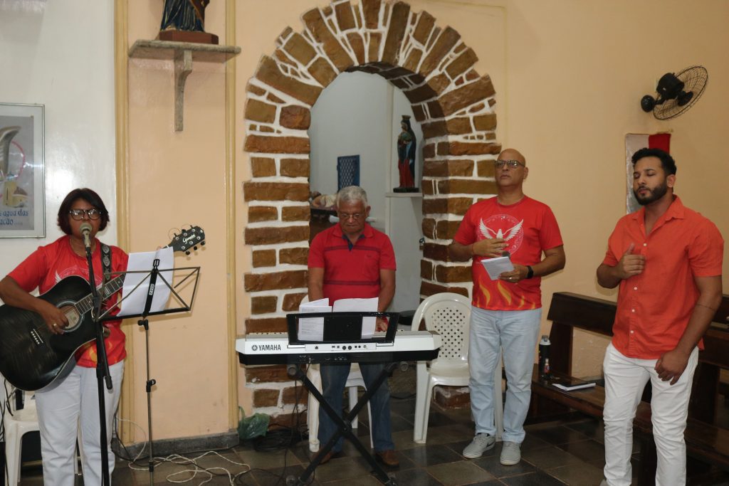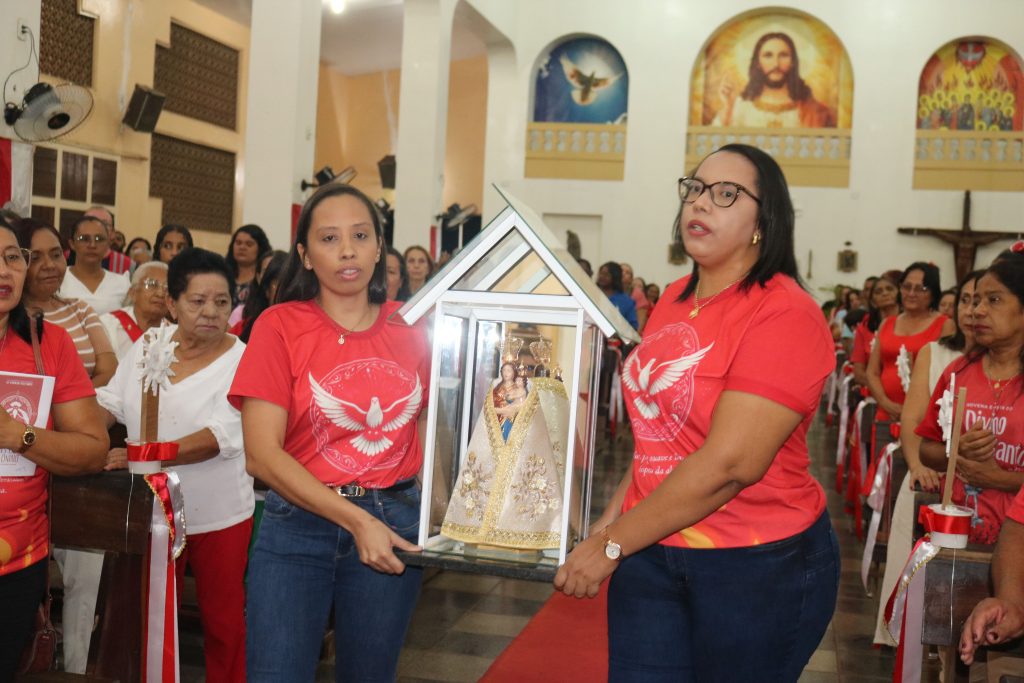 Após a comunhão, a alegria se fez presente com os parabéns entoados para Kaline, aniversariante do dia. Em seguida, um testemunho emocionante da senhora Maria ressoou pelos corredores, compartilhando a graça alcançada através da intercessão do Divino Espírito Santo.