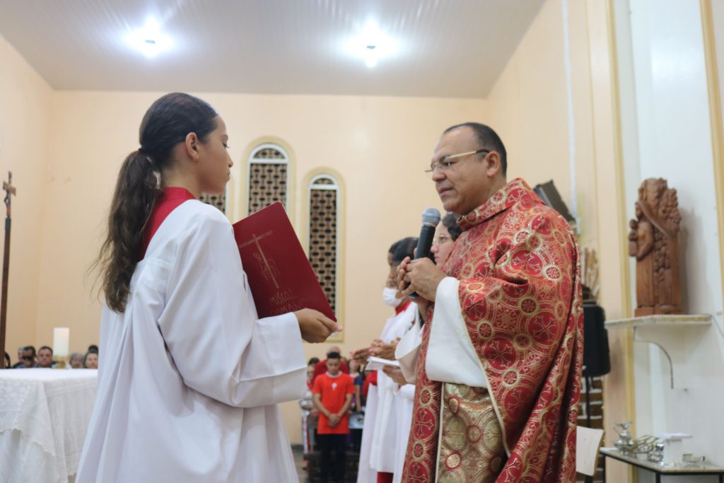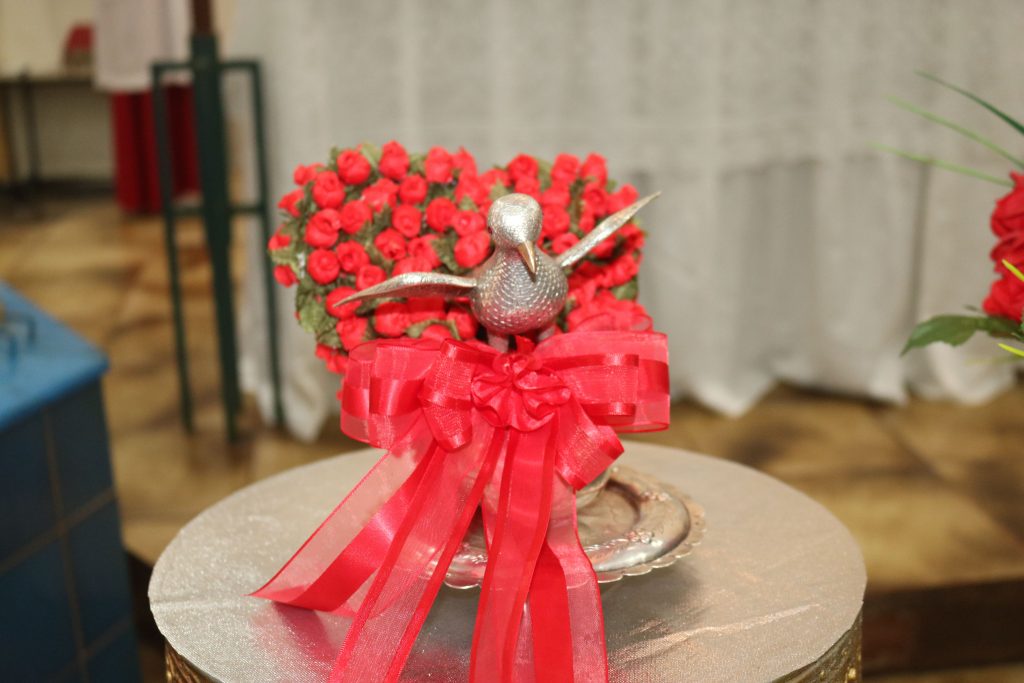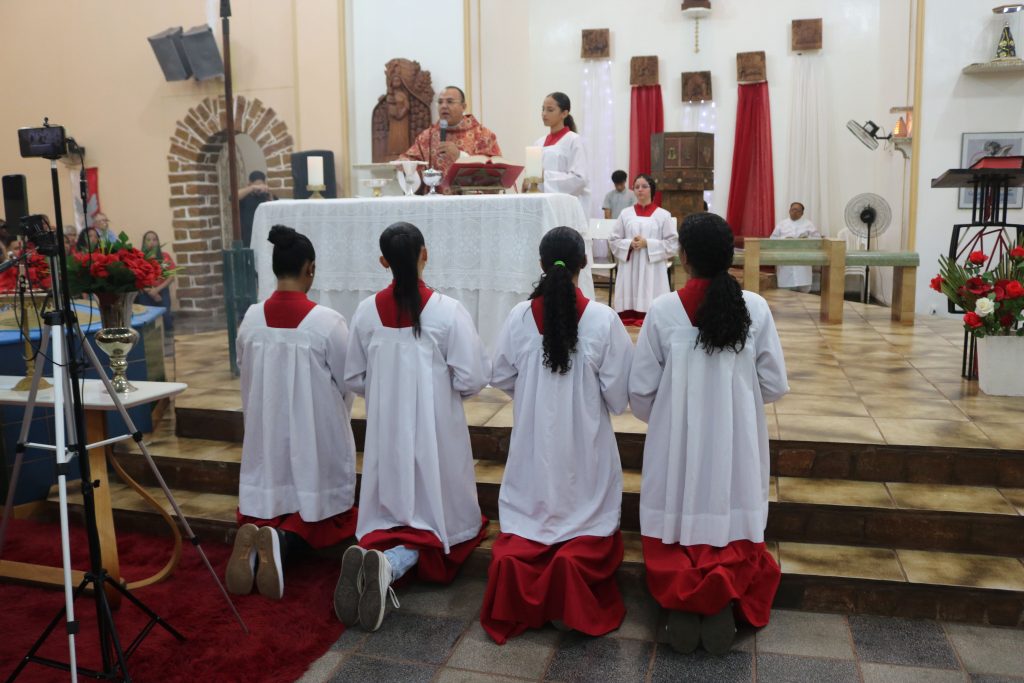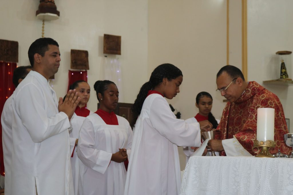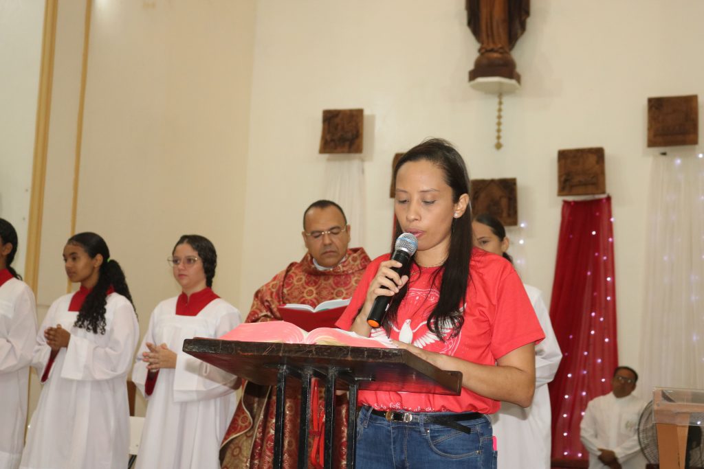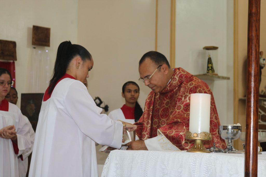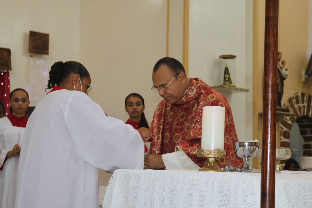 Após a comunhão, a alegria se fez presente com os parabéns entoados para Kaline, aniversariante do dia. Em seguida, um testemunho emocionante da senhora Maria ressoou pelos corredores, compartilhando a graça alcançada através da intercessão do Divino Espírito Santo.