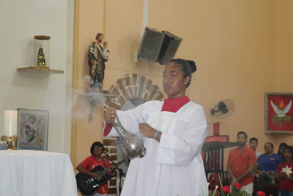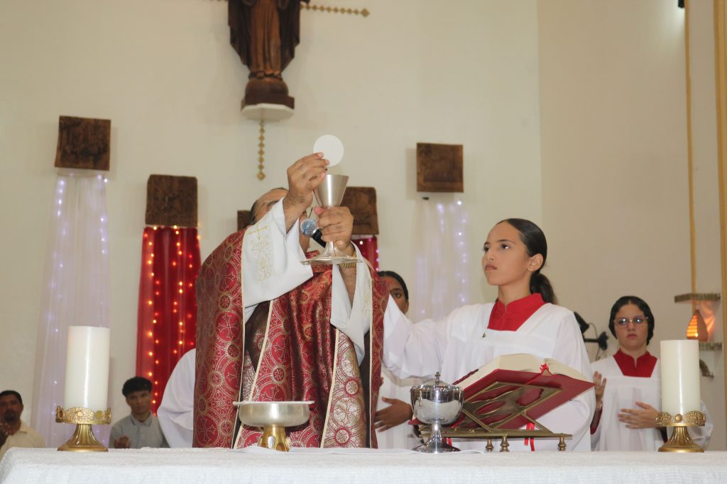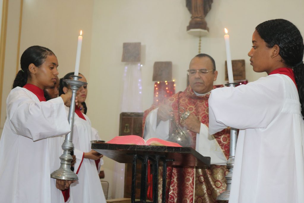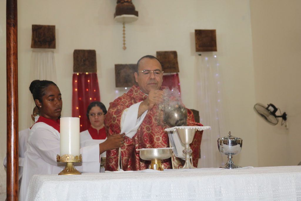 O turíbulo com incenso foi elevado várias vezes durante a celebração, simbolizando as preces e súplicas ascendendo aos céus. Desde o início da liturgia até a consagração do pão e do vinho, o aroma sagrado permeou os ritos, envolvendo os presentes em uma atmosfera de sacralidade e reverência.