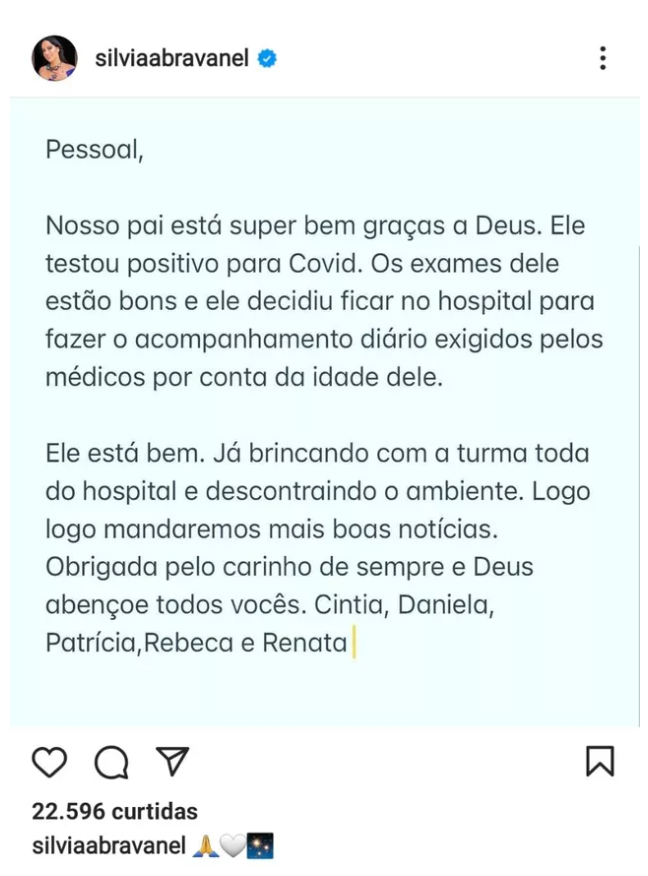 Silvia Abravanel também usou as redes sociais para falar sobre a saúde do pai. Silvia agradeceu o carinho dos fãs e afirmou que os exames estão bons.