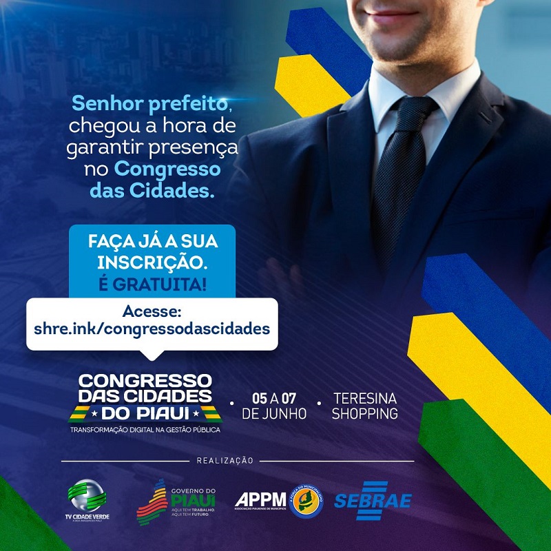 As inscrições para o 3º Congresso das Cidades do Piauí já estão abertas. Prefeitos, secretários, primeiras-damas e profissionais que atuam nas gestões municipais já podem garantir a participação no evento, que acontecerá entre 5 e 7 de junho, no Teresina Shopping. As inscrições são gratuitas, através do link: shre.ink/congressodascidades, e podem ser realizadas até o dia do evento.