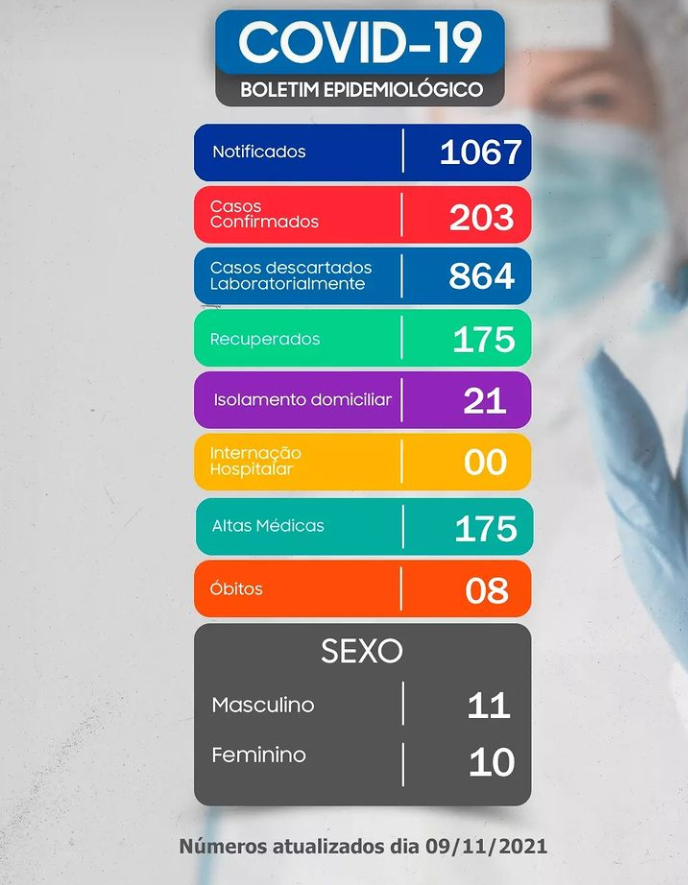 Conforme o boletim epidemiológico divulgado pela Secretaria Municipal de Saúde foi contabilizado e registrado 03 casos confirmados, 02 pessoas recuperadas, 02 casos de isolamento domiciliar e  redução de 01 internação hospitalar em leito clínico em comparação com o boletim anterior.