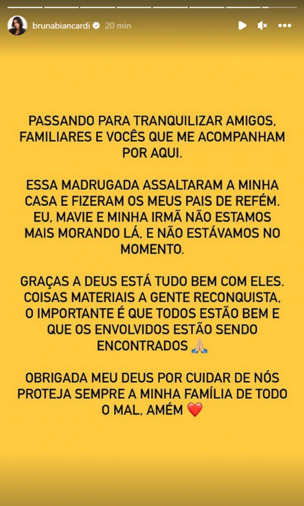 “Passando para tranquilizar amigos, familiares e vocês que me acompanham por aqui. Essa madrugada assaltaram a minha casa e fizeram os meus pais de refém. Eu, Mavie e minha irmã não estamos mais morando lá, e não estávamos no momento”.