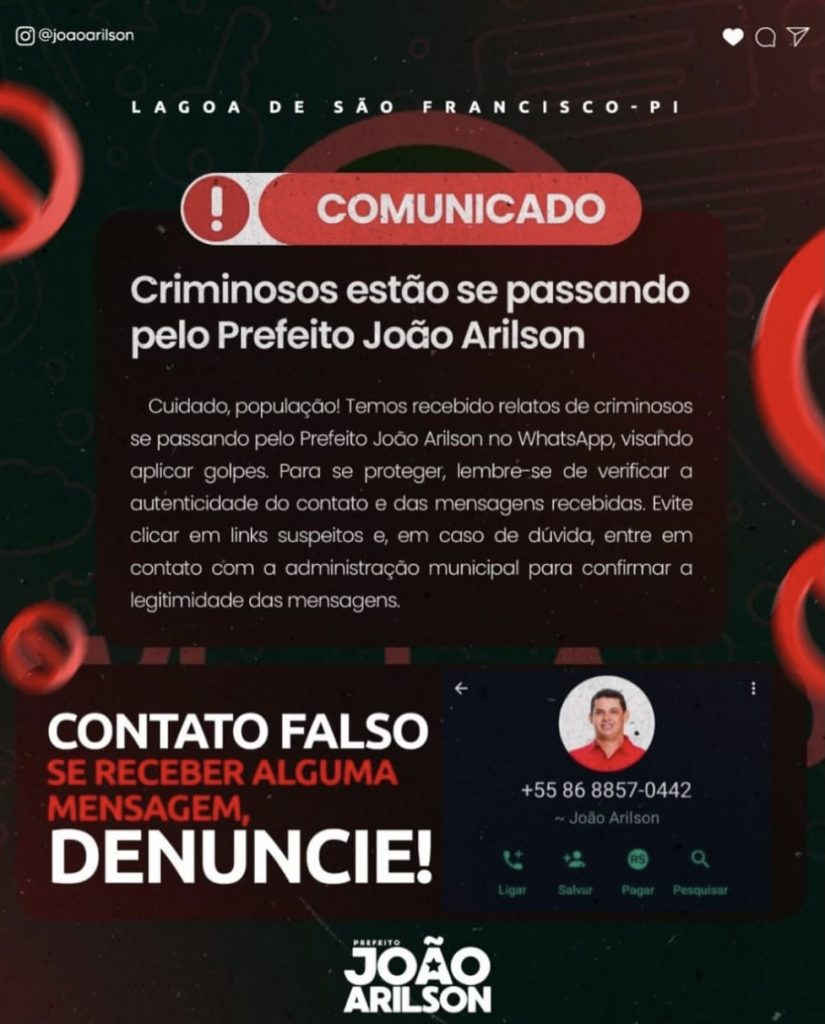 “Cuidado, população! Temos recebido relatos de criminosos se passando pelo Prefeito João Arilson no WhatsApp, visando aplicar golpes. Para se proteger, lembre-se de verificar a autenticidade do contato e das mensagens recebidas. Evite clicar em links suspeitos e, em caso de dúvida, entre em contato com a administração municipal para confirmar a legitimidade das conversas”, publicou o prefeito.