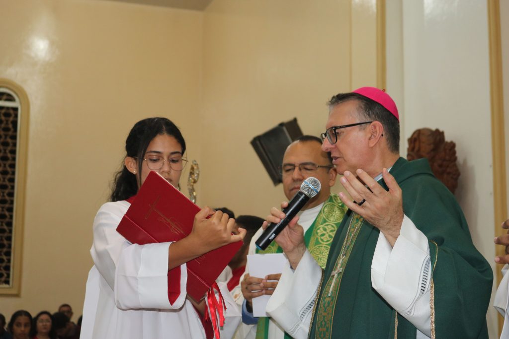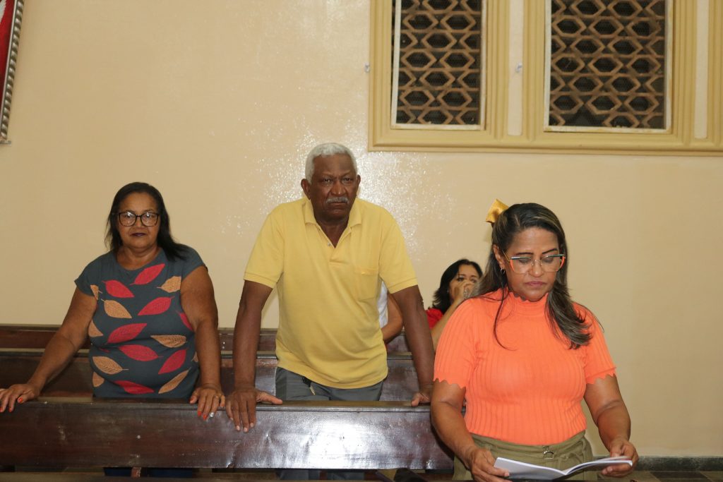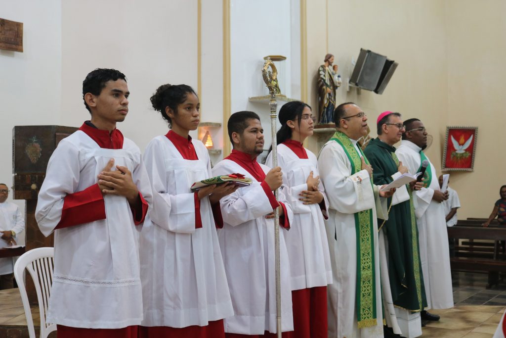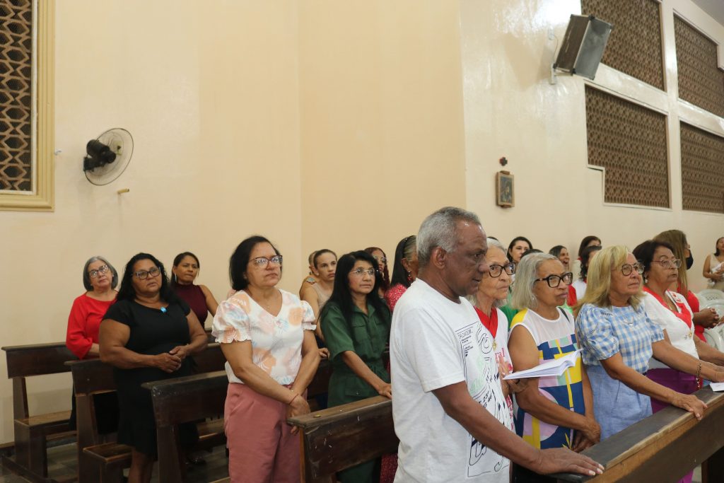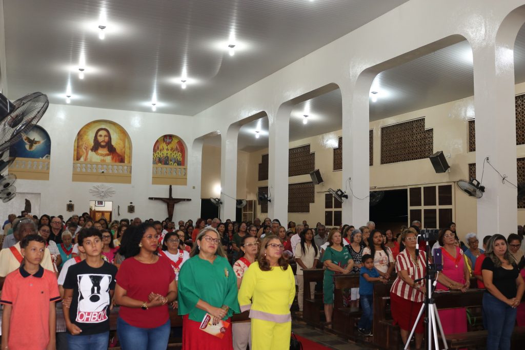 Antes do início da missa, os preparadores de pais e padrinhos coordenaram a reza do terço pelas vocações, um momento de oração e reflexão que precedeu a solene eucaristia.