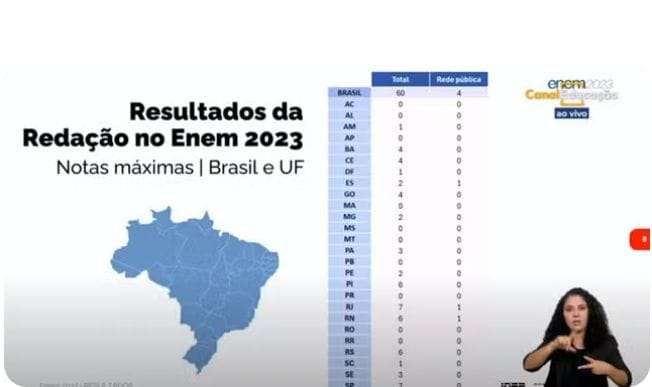 Ao todo, foram 60 notas máximas no país. Em 2022, o número total de redações que haviam tirado a pontuação máxima foi de 18.
