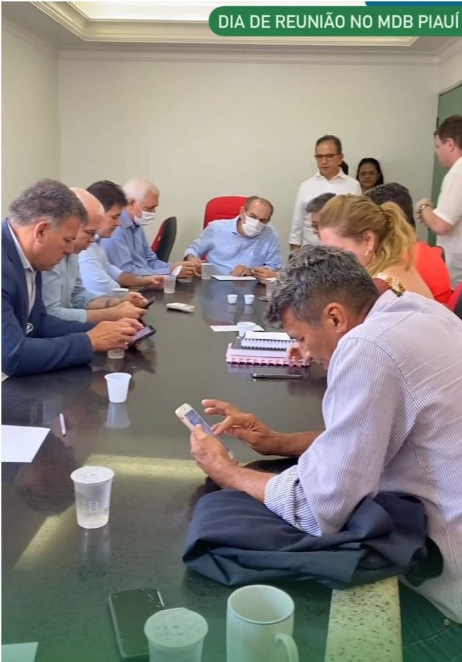 Na reunião de faz de conta do MDB cada um está ligado no celular. Depois Marcelo Castro informou que a rendição ao candidato Fábio Novo e a escolha de Paulo Márcio foram consensuais