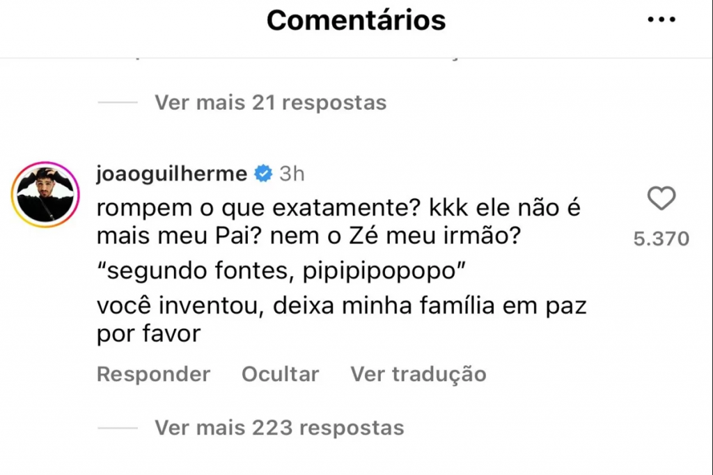 Na postagem desta colunista no Instagram, João debochou da situação: “Rompem o que exatamente? Ele não é mais meu pai? Nem o Zé meu irmão? Você inventou, deixa a minha família em paz”, escreveu ele.