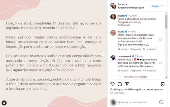 “Há 3 semanas, tivemos a notícia de que seu corpo não estava aceitando o novo órgão. Então, um tratamento mais potente foi iniciado e há 2 dias tivemos a feliz resposta que aguardávamos: a rejeição foi vencida”, escreveu Luciana.