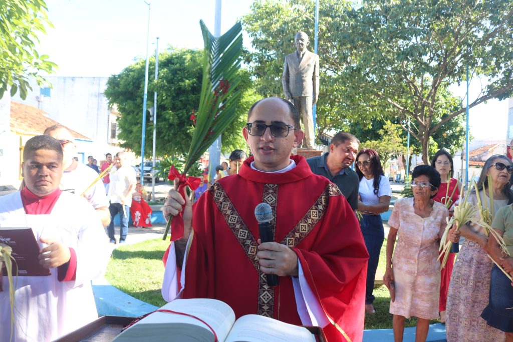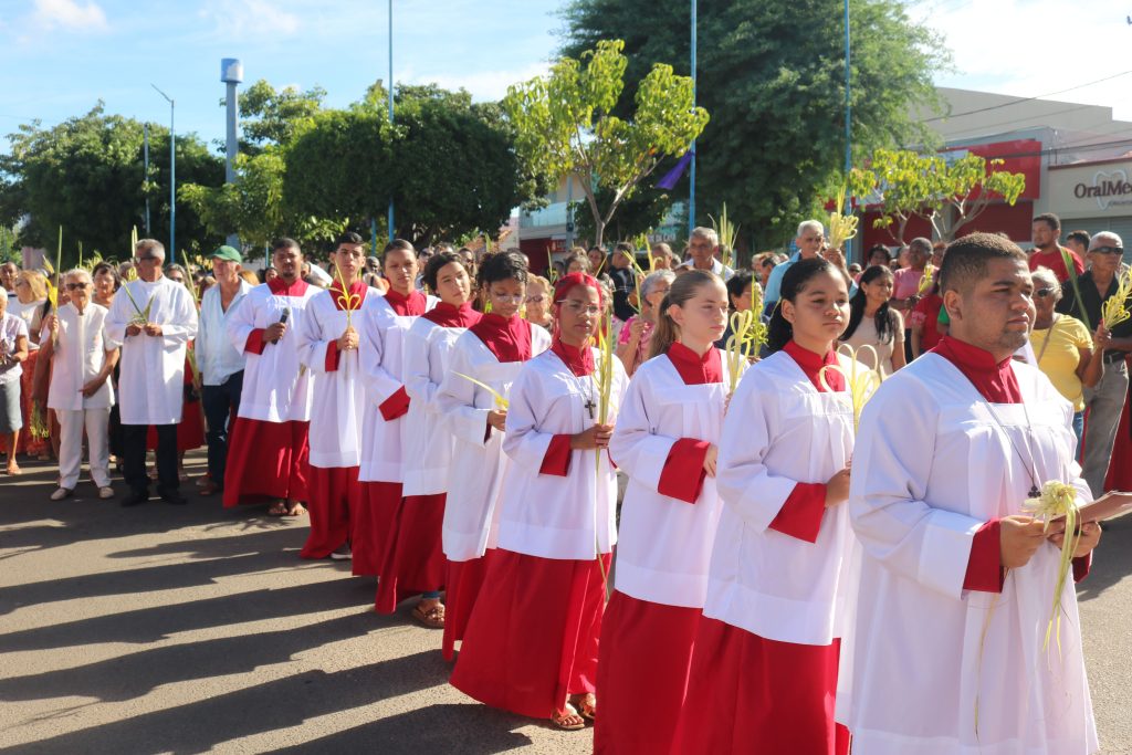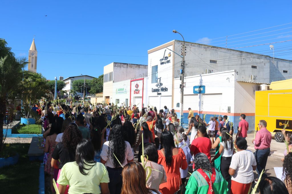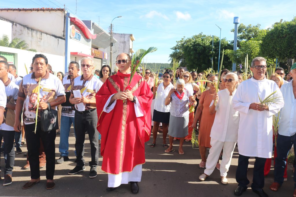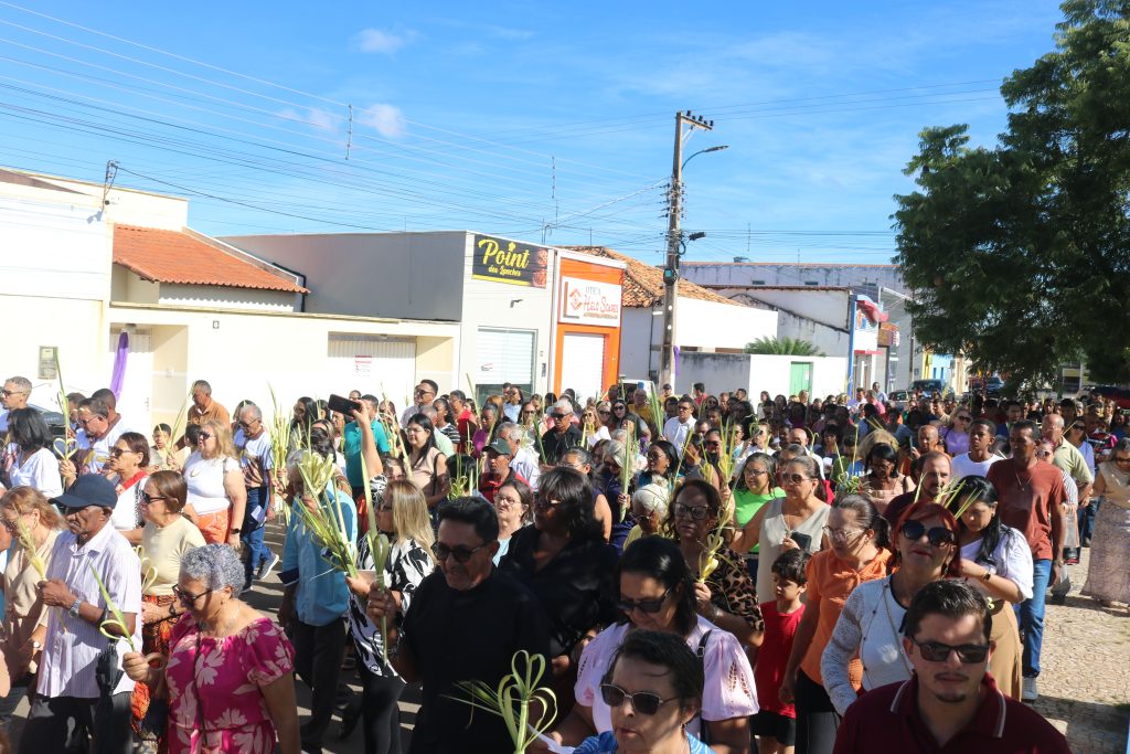 Por volta das 8h, os fiéis se concentraram na Praça Dr. Isaías Coelho, onde o padre Welson Barbosa realizou a bênção dos ramos, relembrando a entrada triunfal de Jesus em Jerusalém. Em seguida, o sacerdote, coroinhas e a multidão de fiéis seguiram em procissão até a Igreja Matriz do Sagrado Coração de Jesus.