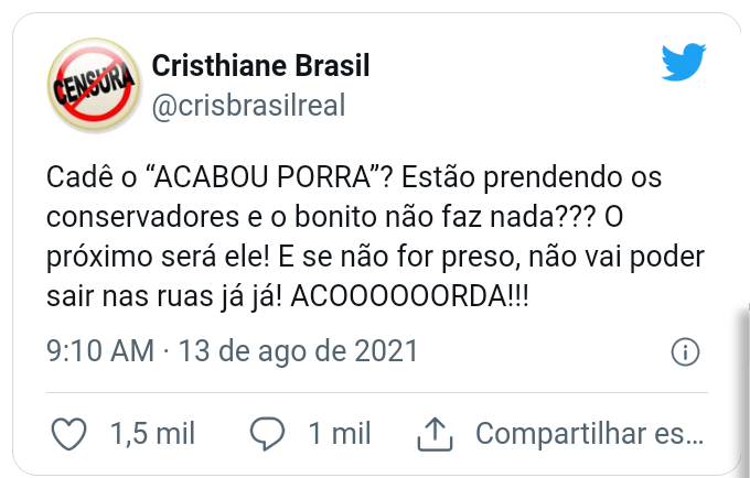 “Cadê o ‘ACABOU PORRA’? Estão prendendo os conservadores e o bonito não faz nada??? O próximo será ele! E se não for preso, não vai poder sair nas ruas já já! ACOOOOOORDA!!!”, escreveu Cristiane em seu Twitter. Ela não mencionou o nome do presidente Bolsonaro, mas em maio do ano passado, o mandatário disse “acabou, porra” durante um discurso no qual criticava a autorização de Moraes a uma operação no âmbito do inquérito das fake news, que apura informações falsas e ataques a ministros do STF.