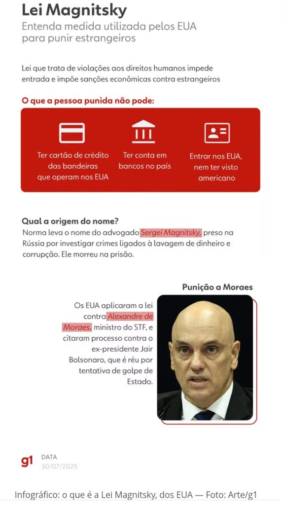 A lei é utilizada pelo governo norte-americano para sancionar estrangeiros. Moraes foi incluído na lista de punidos em julho deste ano.