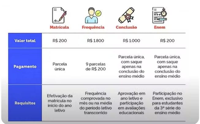O programa oferece um pagamento mensal de R$ 200, que pode ser sacado a qualquer momento, e depósitos anuais de R$ 1.000 ao final de cada ano concluído – que só poderá ser sacado ao fim do ensino médio.