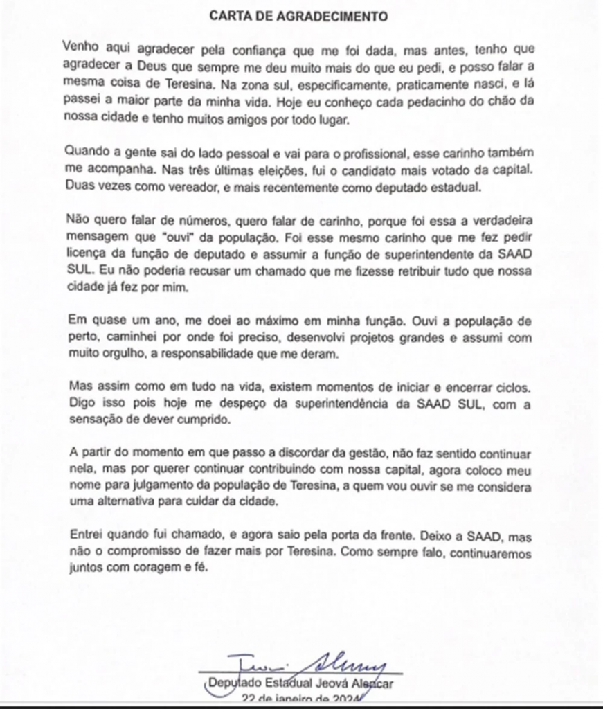Jeová diz que, com sua saída da Saad Sul, ele retorna ao mandato na Assembleia Legislativa do Piauí