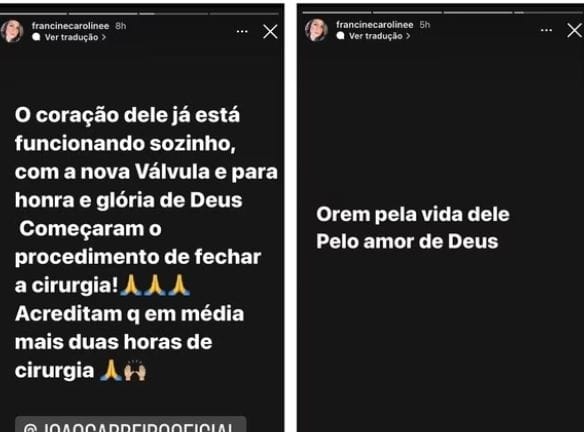 Durante a tarde, Francine publicou uma nova mensagem, dizendo que o coração de João já estava funcionando sozinho com a nova válvula e que a cirurgia estava sendo finalizada.