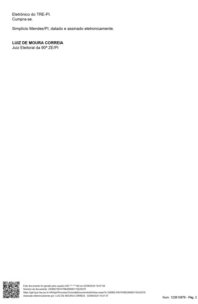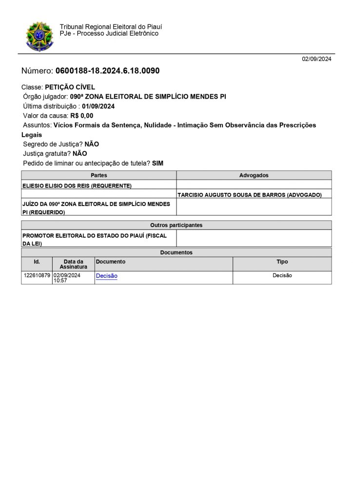 O processo segue com a intimação das partes envolvidas, incluindo o Ministério Público Eleitoral, que terá cinco dias para emitir um parecer antes do retorno dos autos para a sentença final. Eliésio Reis é o candidato da oposição no pleito.