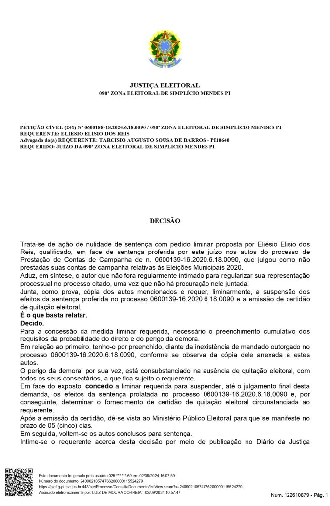 Na manhã desta segunda-feira, 02 de setembro de 2024, a Justiça Eleitoral da 90ª Zona Eleitoral da Comarca de Simplício Mendes deferiu a medida liminar que autoriza a candidatura de Eliésio Reis (PT13) a prefeito de São Francisco de Assis do Piauí. Anteriormente, a candidatura havia sido indeferida devido à falta de prestação de contas da campanha de 2020, o que gerou a condição de inelegibilidade.