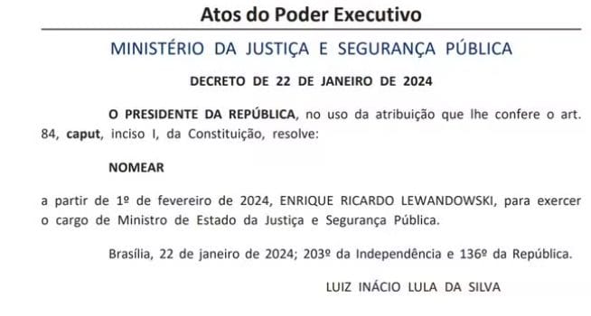 O presidente Luiz Inácio Lula da Silva (PT) oficializou nesta segunda-feira (22) a nomeação de Ricardo Lewandowski para o comando do Ministério da Justiça a partir de 1º de fevereiro. O ato foi publicado no “Diário Oficial da União”.