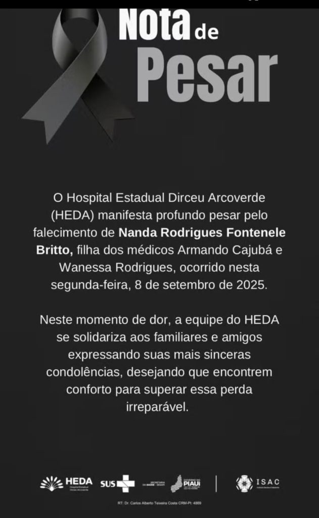 “Nesse momento de dor, a equipe do HEDA se solidariza aos familiares e amigos expressando suas mais sinceras condolências, desejando que encontrem conforto para superar essa perda irreparável”, afirmou a unidade de saúde no comunicado.