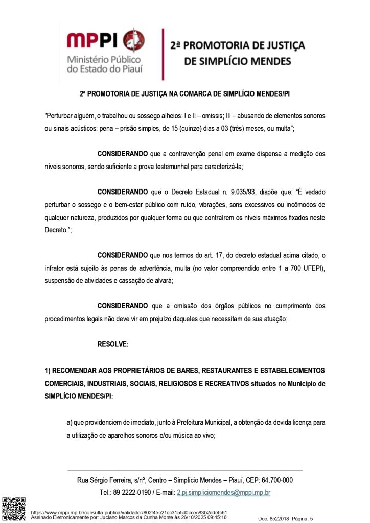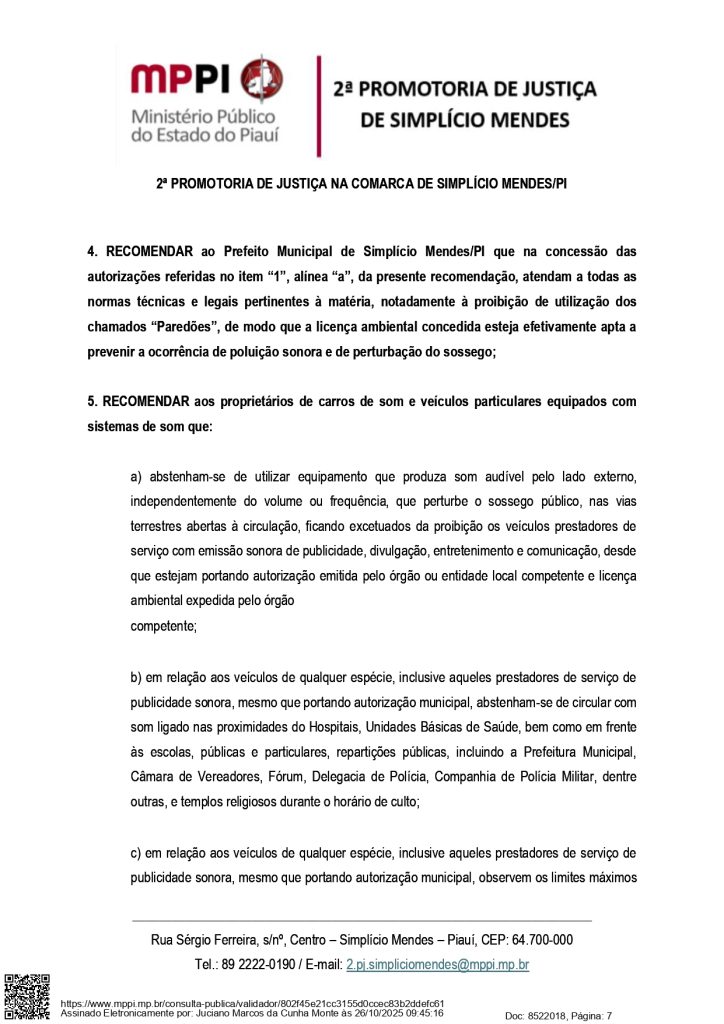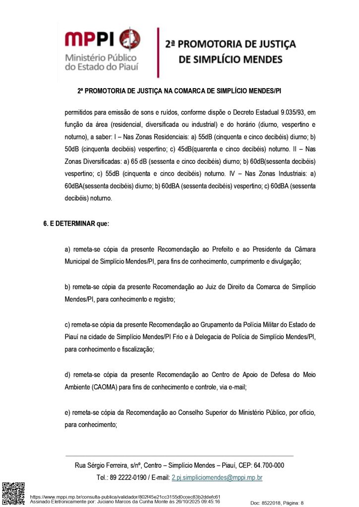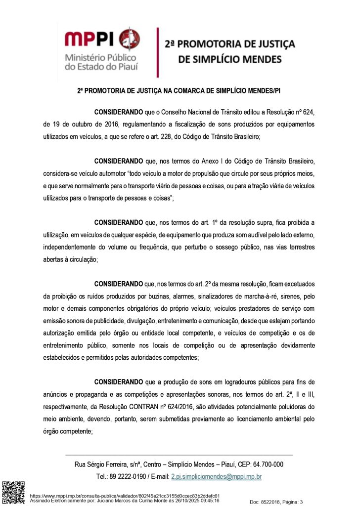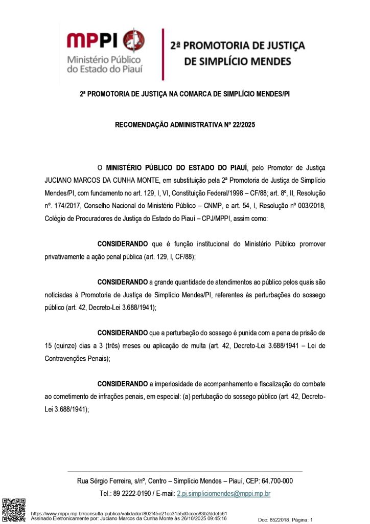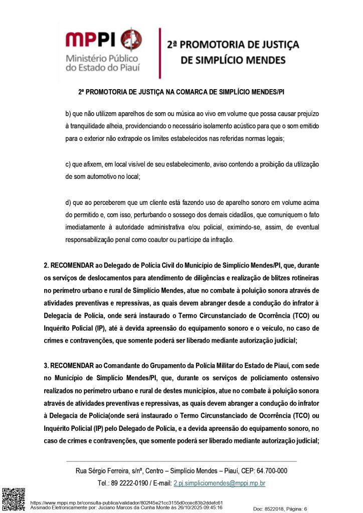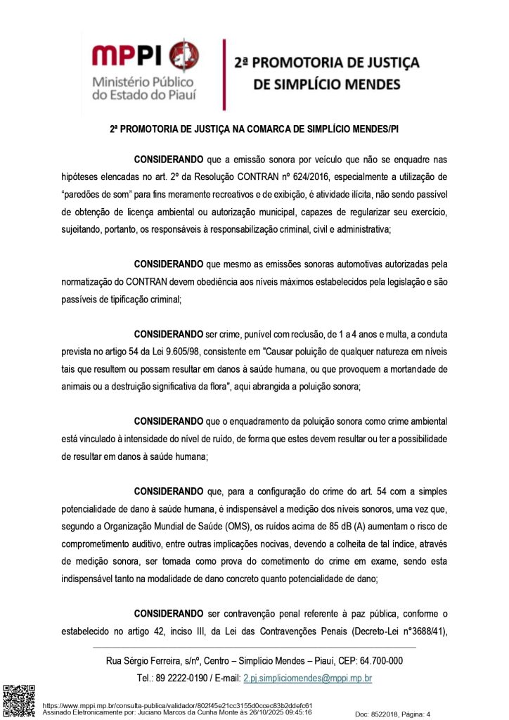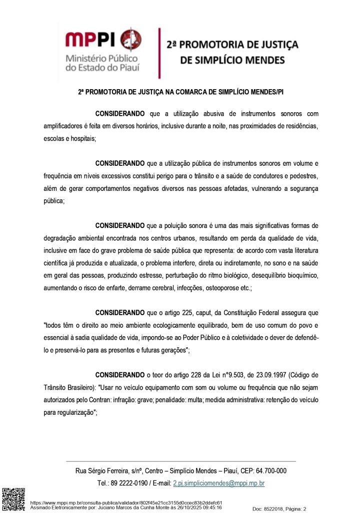 A 2ª Promotoria de Justiça de Simplício Mendes, por meio do Promotor de Justiça Dr. Juciano Marcos da Cunha Monte, divulgou a Recomendação Administrativa nº 22/2025, que visa intensificar as ações de combate à poluição sonora no município.