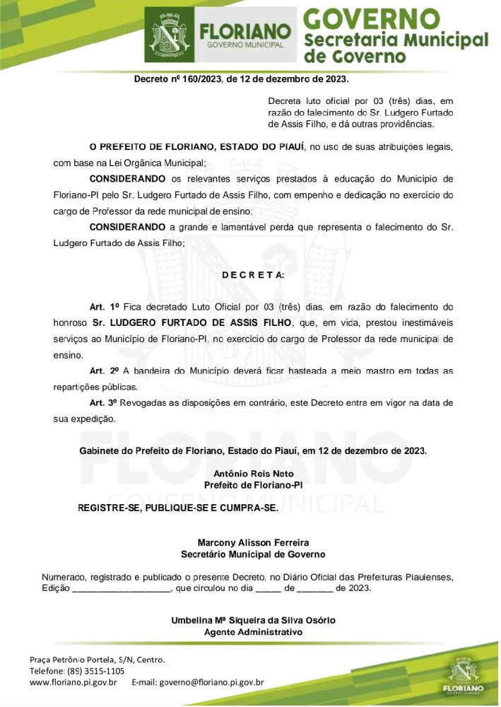 A Prefeitura de Floriano decretou oficial por três dias.