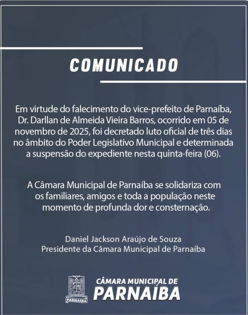 A Prefeitura de Parnaíba divulgou nota de pesar lamentando a morte do gestor e destacando sua trajetória exemplar. “Darllan era uma pessoa querida, acessível e de sorriso fácil, características que o tornaram muito próximo da população”, diz o comunicado.