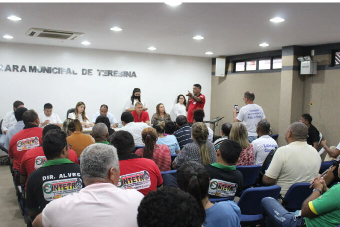 Nas dependências da Câmara Municipal, os vereadores Pollyana Rocha, Enzo Samuel, Deolino Moura, Zé Filho, Elzuila Calisto, Dr. Leonardo e Teresinha Medeiros foram convocados pela Comissão do Transporte e Sintetro para discussão da temática da mobilidade urbana. Em sua fala, o presidente do Sintetro, Antônio Cardoso, citou as propostas repassadas pela prefeitura e exigiu o posicionamento do poder legislativo municipal.