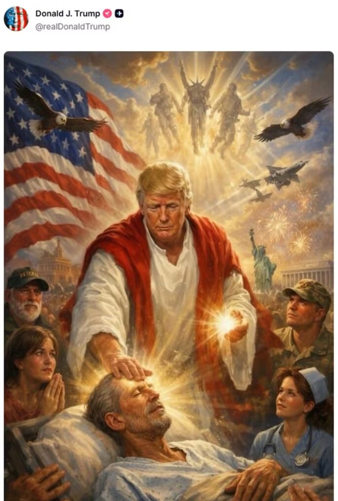 Alguns minutos depois, Trump publicou uma imagem gerada por inteligência artificial em que retrata ele com uma túnica branca abençoando um homem doente. A imagem ainda mostra a bandeira dos Estados Unidos, a Estátua da Liberdade, caças de guerra, uma aeronave espacial e gaviões.