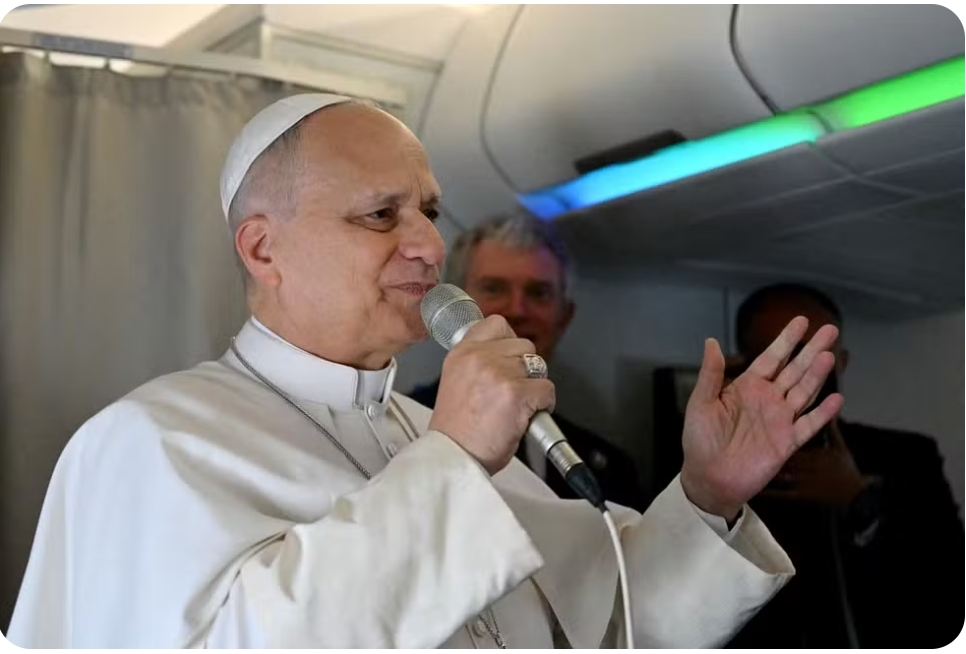 O Papa Leão XIV discursa para jornalistas durante o voo para Argélia — Foto: ALBERTO PIZZOLI/Pool via REUTERS