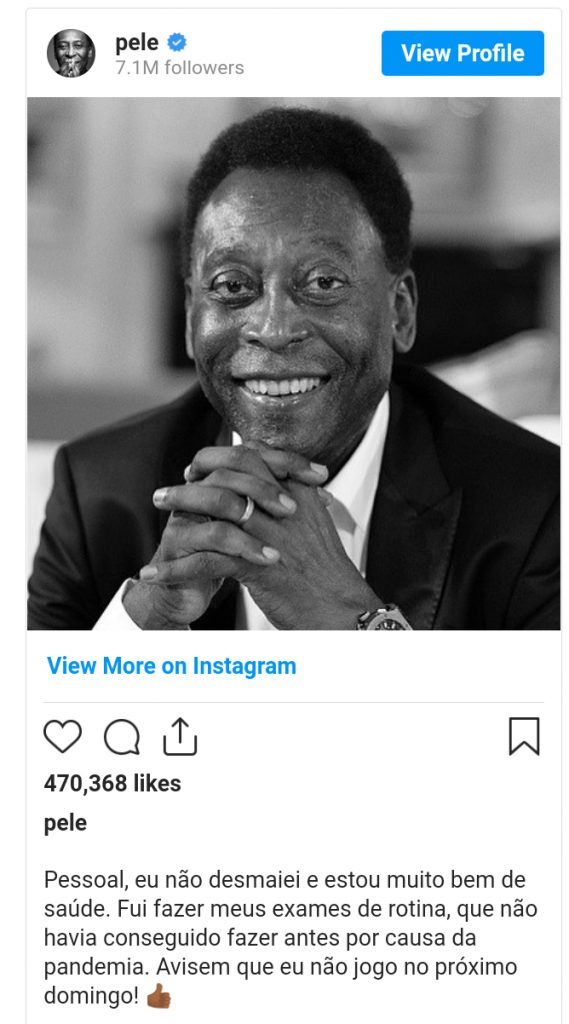 No dia em que deu entrada na unidade, a equipe de comunicação do ex-camisa 10 da Seleção usou as redes sociais do próprio Pelé para tranquilizar os fãs (veja abaixo) e afirmar que ele não havia desmaiado, e estava muito bem de saúde.