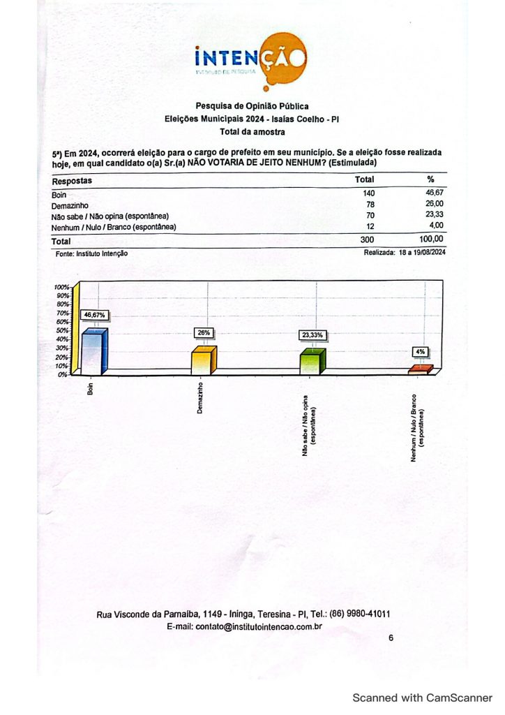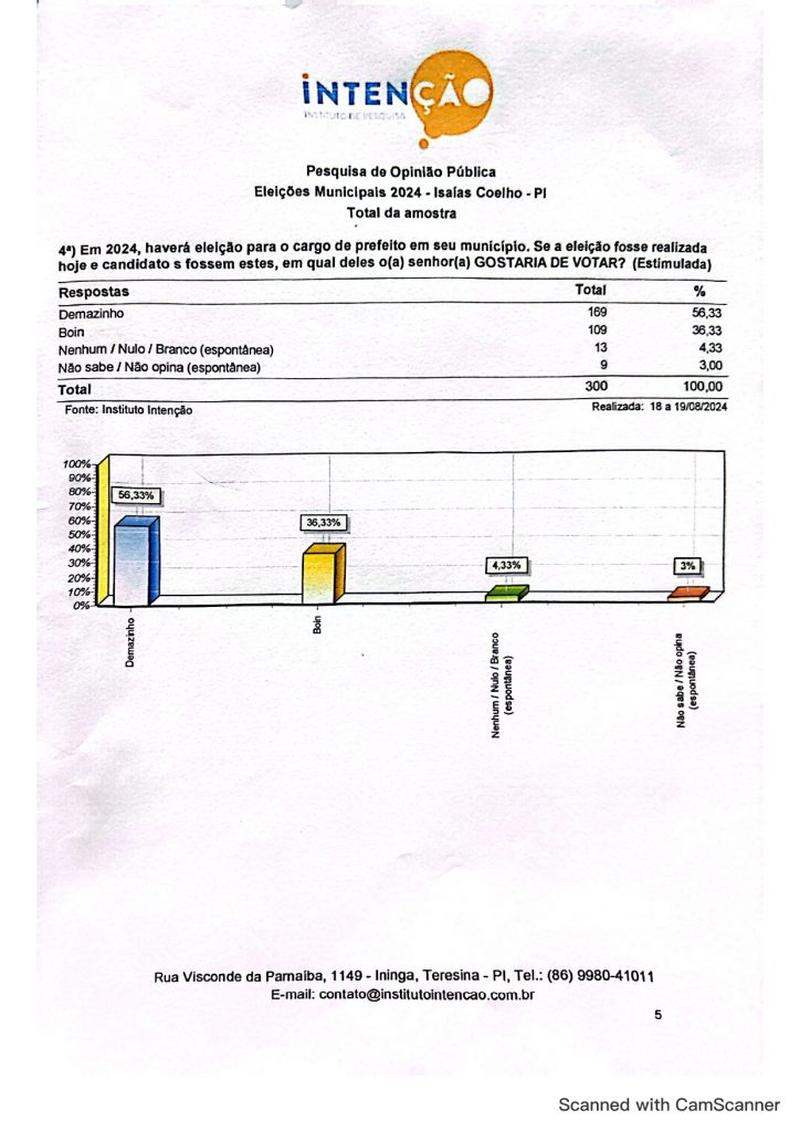 Uma pesquisa eleitoral registrada sob o número PI-00319/2024 pelo Instituto Intenção e realizada nos dias 18 e 19 de agosto de 2024, na cidade de Isaías Coelho/PI, e divulgada nesta quarta-feira (28), revela a liderança do candidato da oposição, Demazinho (PDT), na corrida pela prefeitura do município. Com 56,33% das intenções de voto, Demazinho se destaca à frente de Boin (MDB), candidato da situação, que registra 36,33%. A pesquisa, que entrevistou 300 eleitores e tem um nível de confiabilidade de 95% com margem de erro de 5,56%, também mostrou que 4,33% dos entrevistados optariam por nenhum dos candidatos, votariam em branco ou nulo, enquanto 3% não souberam ou não quiseram opinar.
