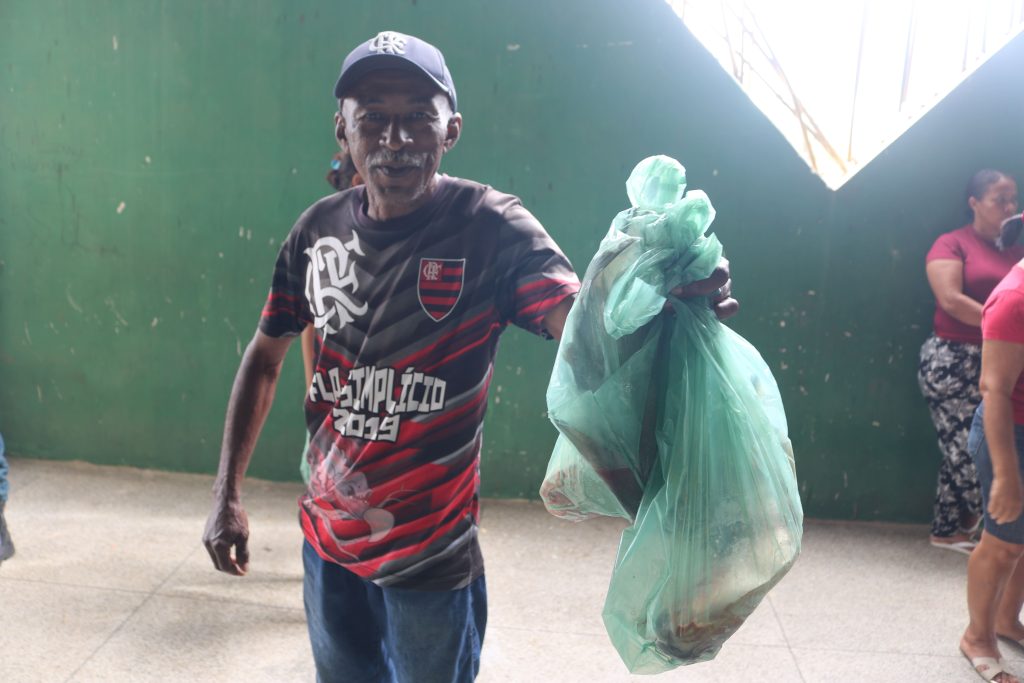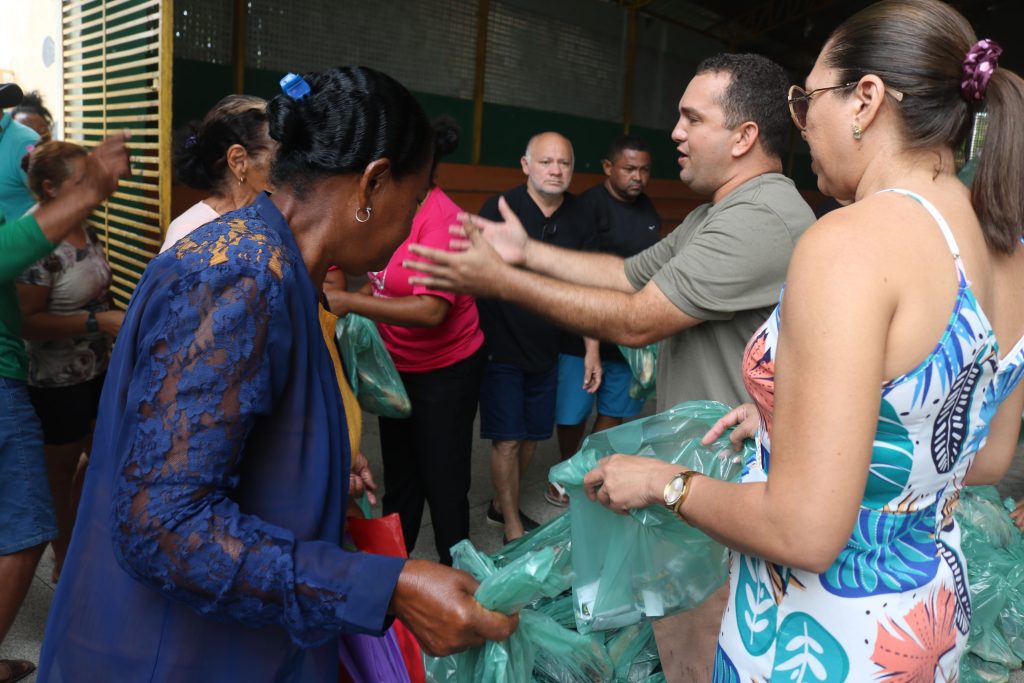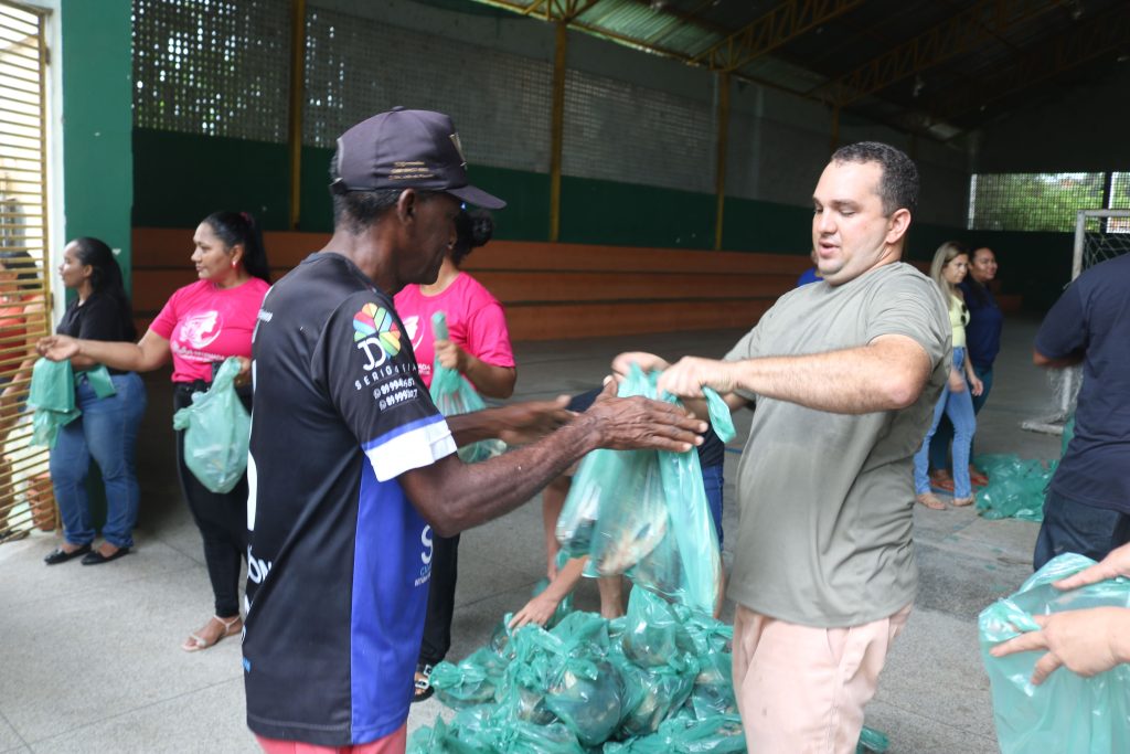 Durante a ação, o prefeito acompanhou de perto toda a organização e participou ativamente da entrega, assegurando que o alimento chegasse de forma adequada às mãos dos moradores.
