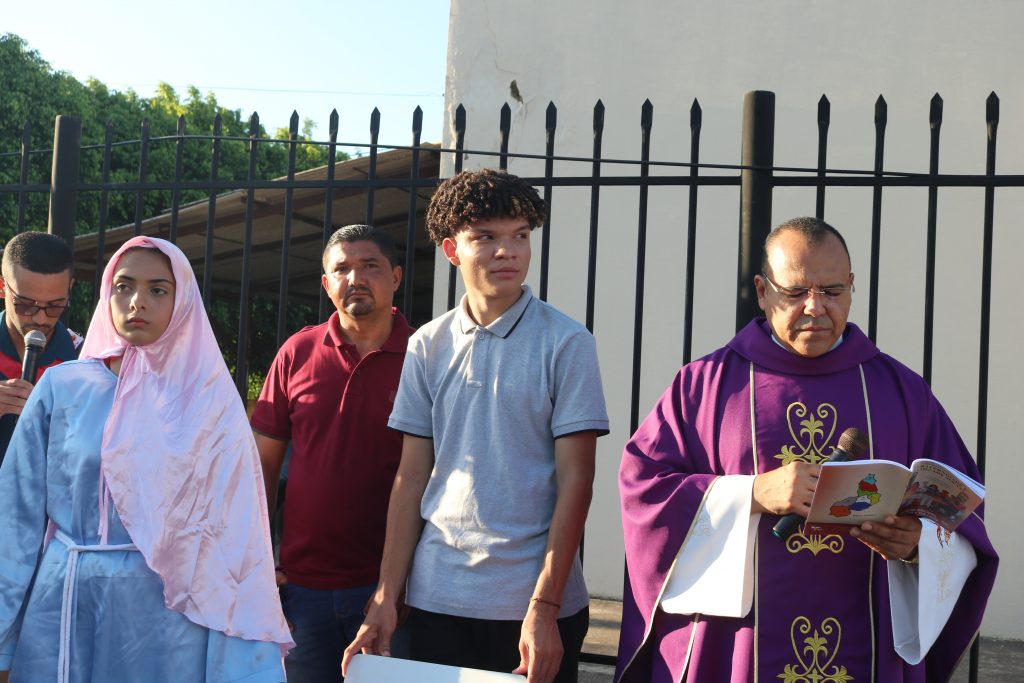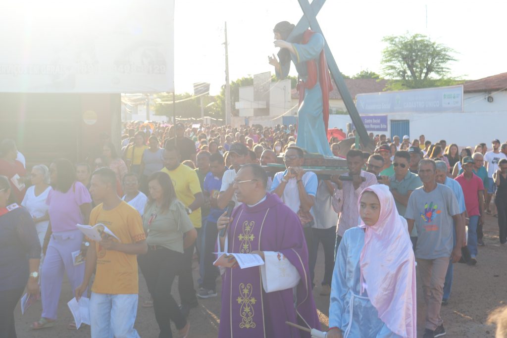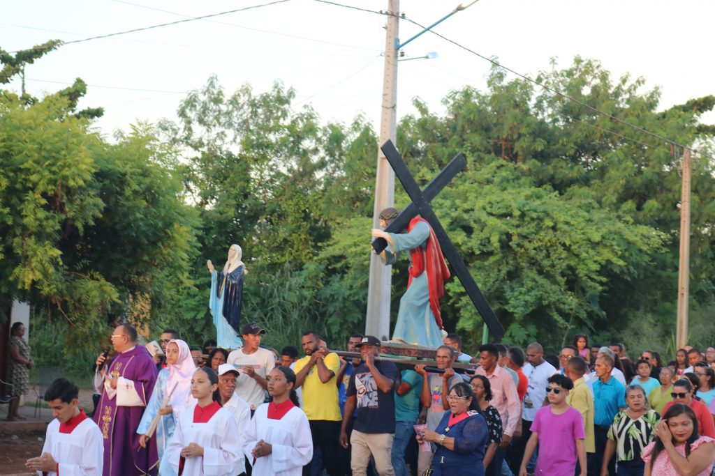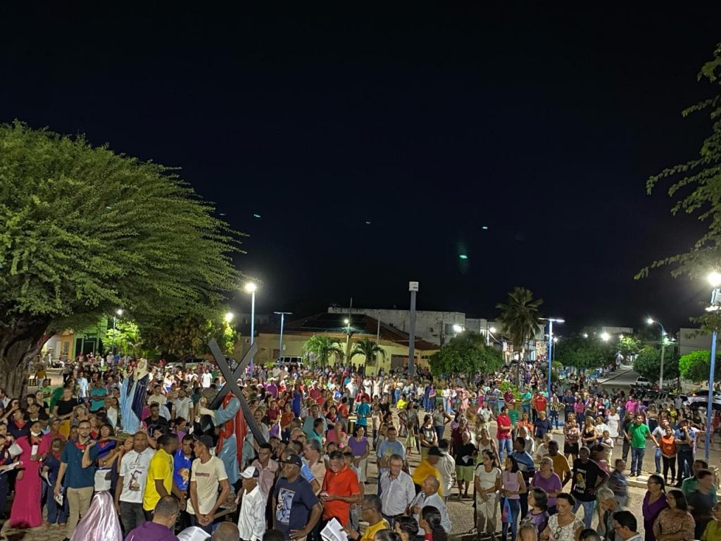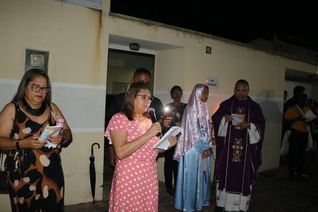 Nesse local, os corações se enchem de emoção e os olhos se enchem de lágrimas, enquanto o Pároco Padre Kleyton Vieira proferia o sermão, renovando a mensagem de amor e redenção. Em meio ao canto das lamentações entoado por Keyla Carvalho em algumas estações, a procissão segue seu curso, mantendo viva a tradição que une gerações em um só propósito: a celebração da fé.