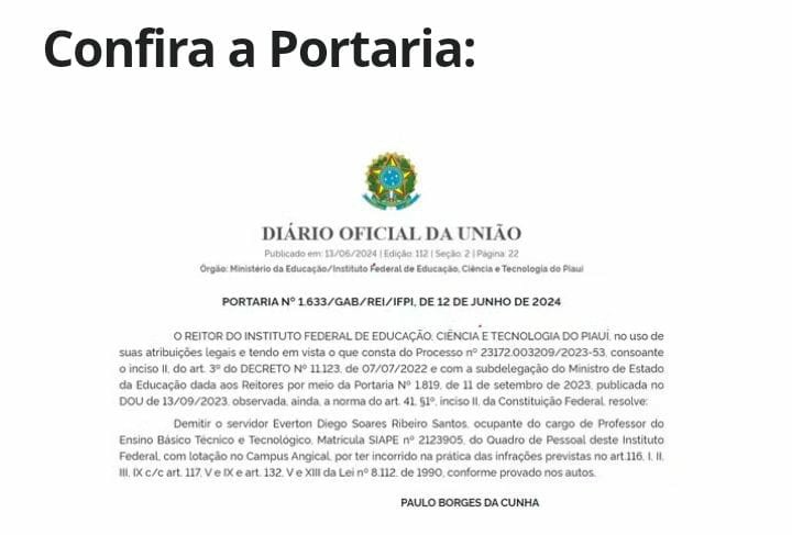 O professor Everton Diego Soares, denunciado por assédio sexual contra uma ex-aluna, foi exonerado do Instituto Federal do Piauí (IFPI), Campus Angical, a 126 km de Teresina. A decisão foi publicada no Diário Oficial da União, nesta quinta-feira (13).