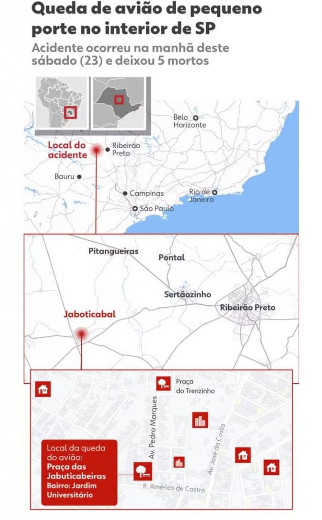As cinco pessoas que morreram na queda de um avião de pequeno porte na manhã deste sábado (23) em uma praça de Jaboticabal (SP) eram da mesma família. São três adultos, uma criança e uma adolescente entre as vítimas.