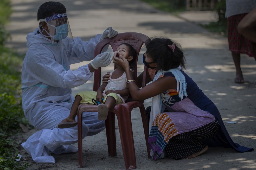 Trabalhador de saúde indiano coleta swab nasal de criança para teste de Covid-19 na vila de Burha Mayong, distrito de Morigaon, estado de Assam, na Índia, em 22 de maio de 2021 — Foto: Anupam Nath/AP