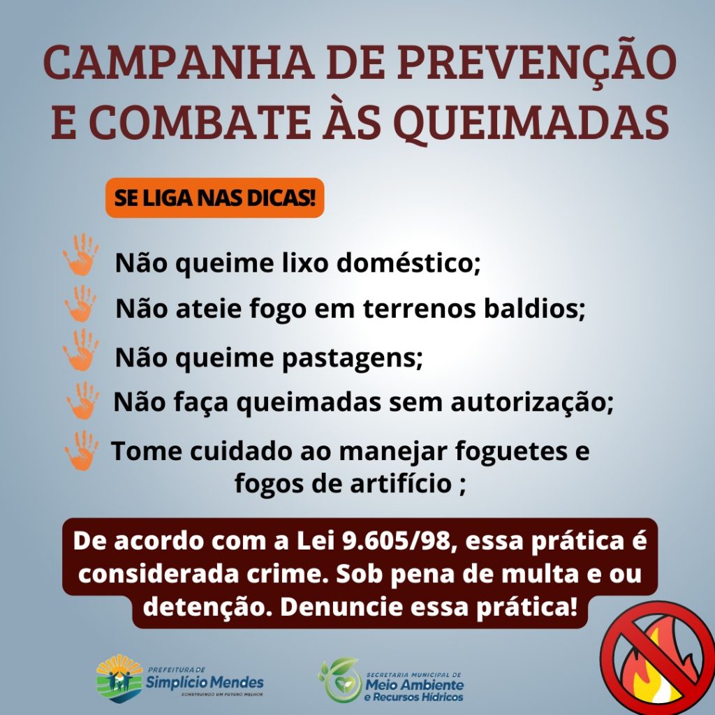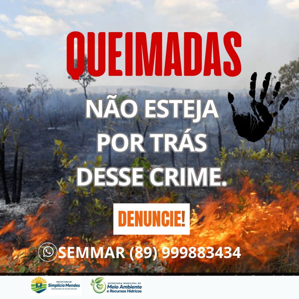 O Secretário Municipal de Meio Ambiente e Recursos Hídricos, Ricardo Moura Luz Costa, faz um alerta a todos os Simplício Mendenses que todos os anos em nossa cidade, as queimadas e incêndios causam grandes danos à natureza, prejudicando o solo e o ar, além de colocar em risco patrimônios públicos, privados e a saúde das pessoas. Para prevenir essa prática a Secretaria Municipal de Meio Ambiente e Recursos Hídricos deu início desde o dia 21 de agosto a Campanha de Prevenção e Combate às Queimadas.