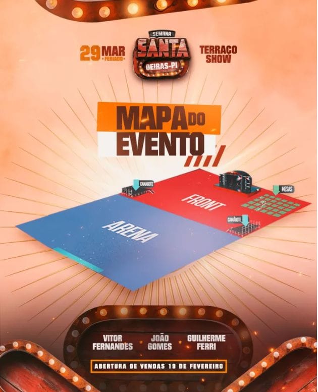 Os ingressos estão disponíveis no Show De Bola. Este evento promete ser a melhor festa da Semana Santa do Piauí. No dia 29 de março, o Terraço Show será o local do espetáculo. Os participantes terão a oportunidade de assistir aos espetáculos ao vivo de Vitor Fernandes, João Gomes e Guilherme Ferri.