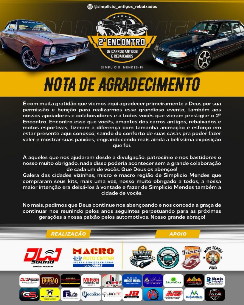 Os organizadores emitiram uma nota de agradecimento pelo grandioso sucesso do evento, destacando a expressiva participação de colecionadores e expositores, bem como agradecendo calorosamente aos patrocinadores que tornaram possível a realização deste encontro que celebra a paixão pelos carros antigos e rebaixados em Simplício Mendes. A cidade já aguarda ansiosamente pela próxima edição desse espetáculo automotivo.